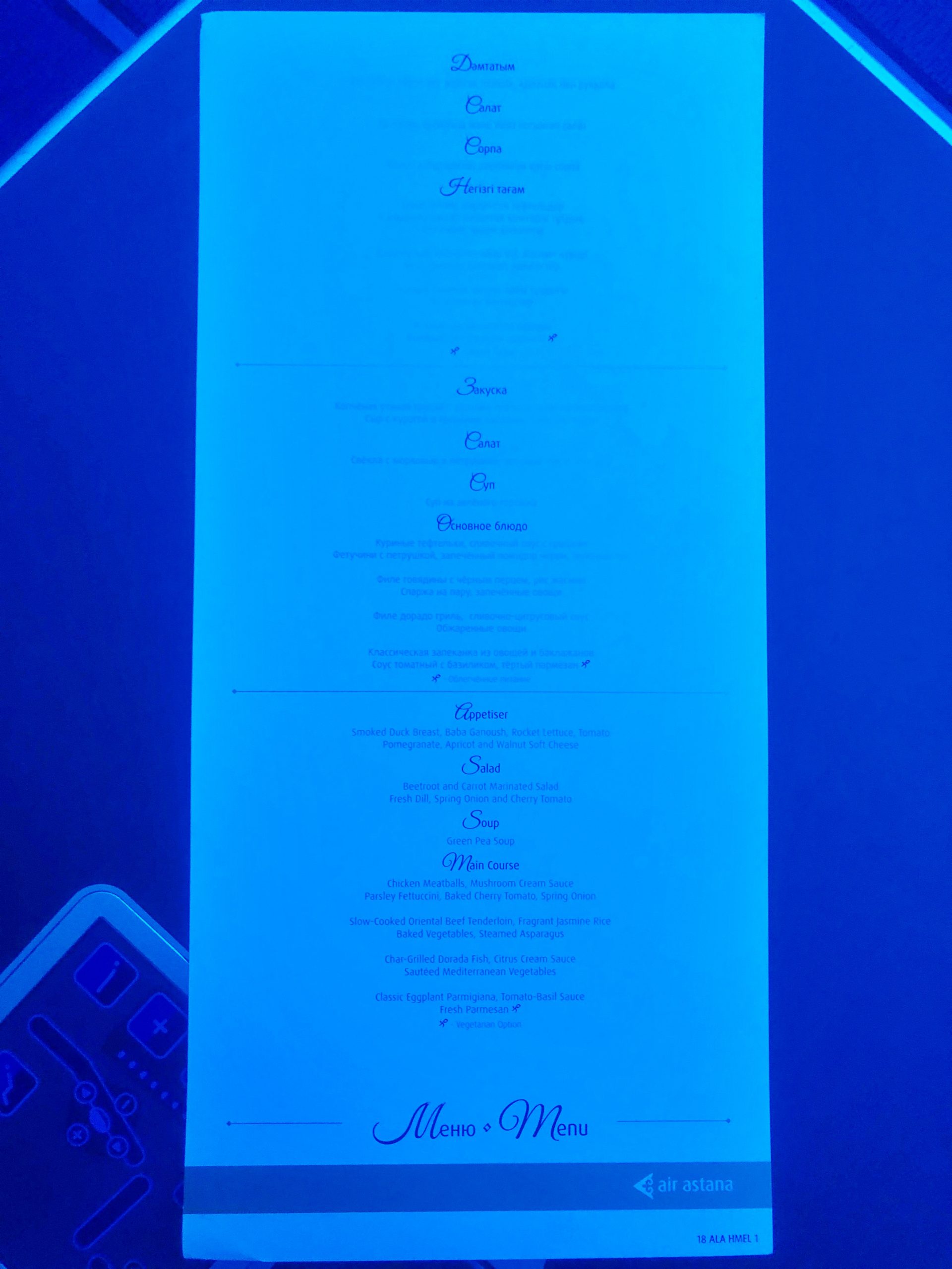 Air Astana – Klasa Biznes w Boeing B767 Almaty – Bangkok – menu