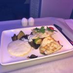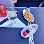 Pół godziny po rozkładowym czasie startu samolot rozpoczyna kołowanie do progu pasa, a załoga zbiera zamówienie na posiłki. Wzorem poprzedniego rejsu, przed serwisem podane są ciepłe wilgotne ręczniczki. Następnie serwowane są napoje i amuse bouche (prażona fasolka oraz szaszłyk warzywno-serowy). Załoga ponownie jest niezwykle szybka i zorganizowana. Wymiana talerzy, nakrycie stolika, czy podanie napojów to kwestia chwili. Dodatkowo, Stewardessy są sympatyczne, z każdym pasażerem zamienią kilka słów.