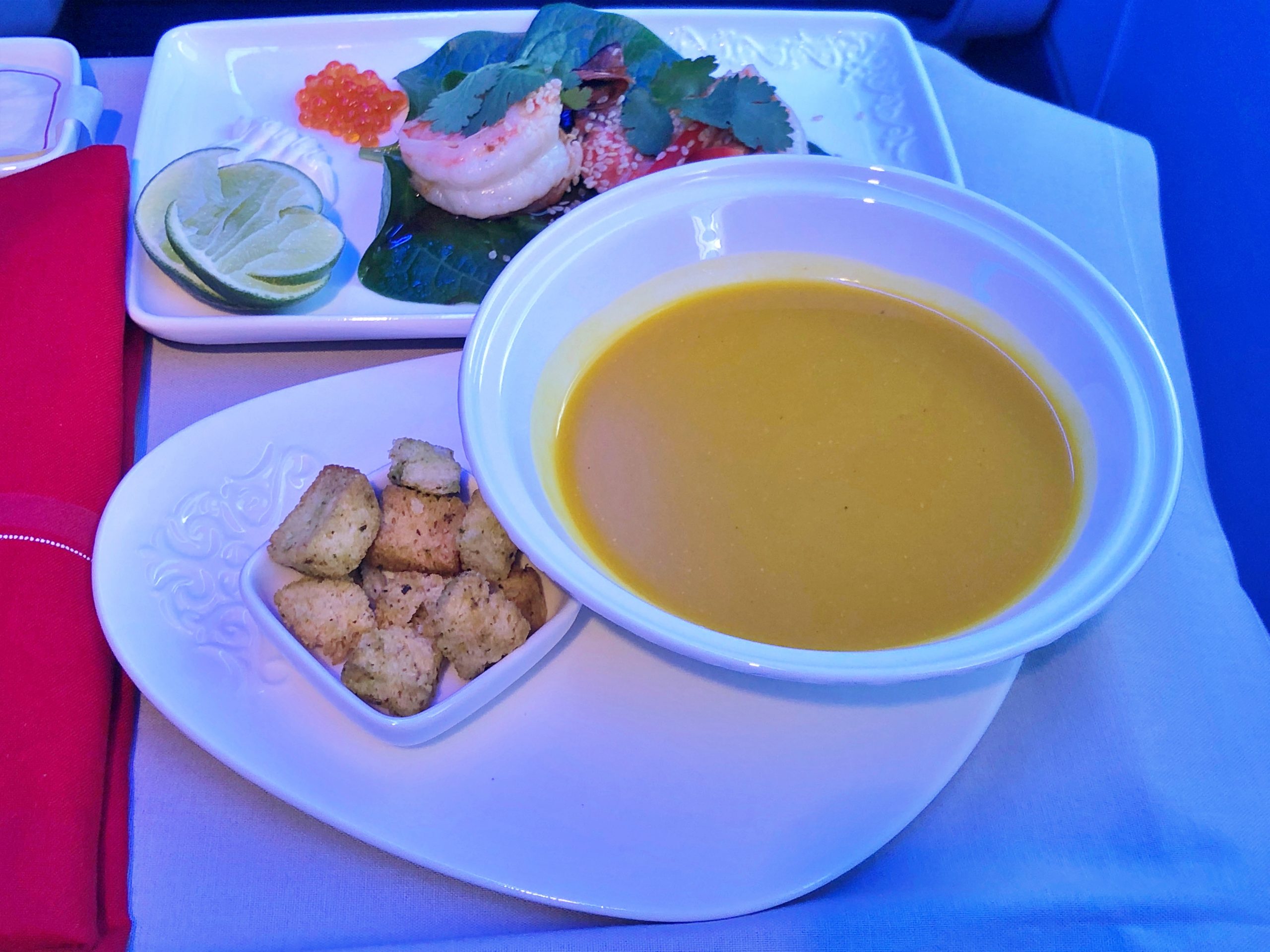 Air Astana – Klasa Biznes w Boeing B767 Bangkok – Almaty – zupa z dyni z kokosem i grzankami czosnkowo-paprykowymi, krewetki tygrysie w limonce, czosnku i sezamie, z dodatkiem ikry łososia, sosu hoisin i świeżej limonki