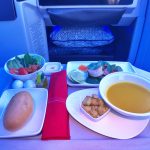 Air Astana – Klasa Biznes w Boeing B767 Bangkok – Almaty – zupa z dyni z kokosem i grzankami czosnkowo-paprykowymi, krewetki tygrysie w limonce, czosnku i sezamie, z dodatkiem ikry łososia, sosu hoisin i świeżej limonki, pieczywo, sałatka z awokado, pomidorkami, miksem sałat i salsą pomidorową