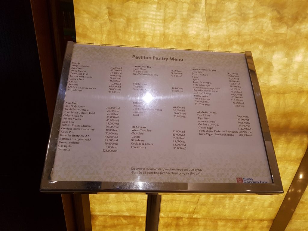 Hilton Honors – Hilton Garden Inn Hanoi – Pavilion Pantry – menu (cennik)