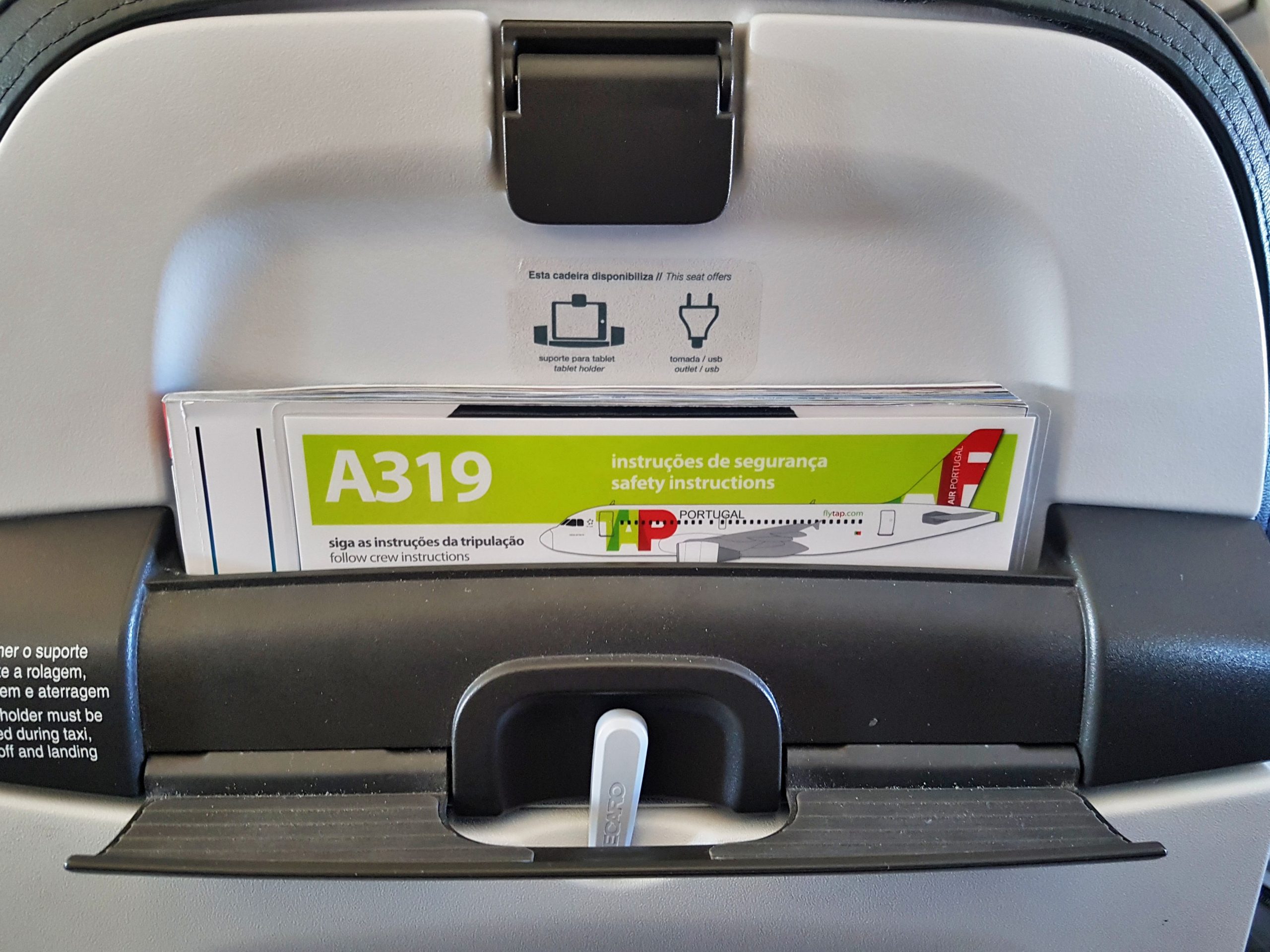 TAP Portugal – Klasa Biznes w Airbus A319 Warszawa – Lizbona – gniazdo ładowania 230V/110V oraz gniazdo USBTAP Portugal – Klasa Biznes w Airbus A319 Warszawa – Lizbona – tył fotela, instrukcja bezpieczeństwaTAP Portugal – Klasa Biznes w Airbus A319 Warszawa – Lizbona – tył fotela, uchwyt na telefon/tablet, instrukcja bezpieczeństwaTAP Portugal – Klasa Biznes w Airbus A319 Warszawa – Lizbona – instrukcja bezpieczeństwa dotycząca uchwytu na telefon/tabletTAP Portugal – Klasa Biznes w Airbus A319 Warszawa – Lizbona – tablet zainstalowany w wygodnym uchwycieTAP Portugal – Klasa Biznes w Airbus A319 Warszawa – Lizbona – nawiew i oświetlenie górne