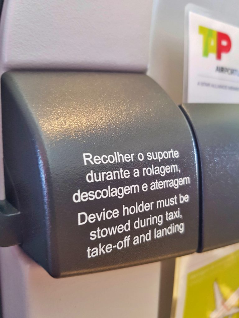 TAP Portugal – Klasa Biznes w Airbus A319 Warszawa – Lizbona – instrukcja bezpieczeństwa dotycząca uchwytu na telefon/tablet