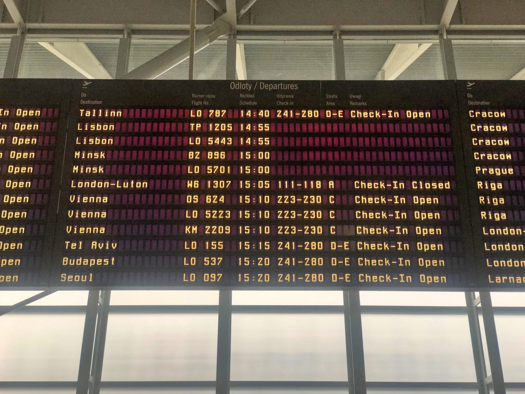 TAP Portugal – Klasa Biznes w Airbus A319 Warszawa – Lizbona – tablica odlotów na lotnisku im. Fryderyka Chopina w Warszawie