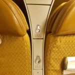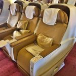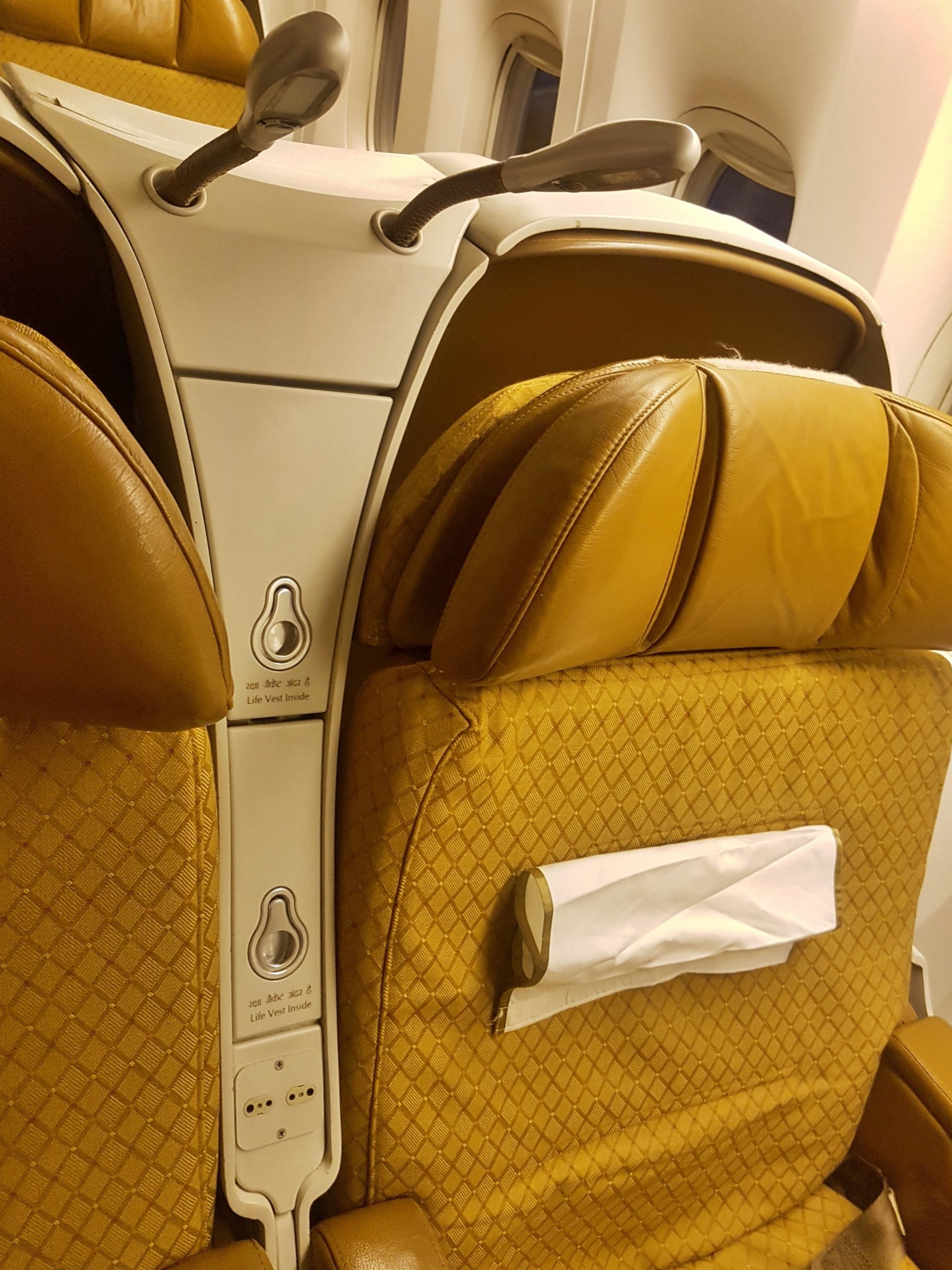 Kiedy ostatecznie udało nam się znaleźć w samolocie, udaliśmy się na swoje miejsca – w pierwszym rzędzie drugiej kabiny klasy biznes, na prawo od wejścia do samolotu. Pierwszym, co nas uderzyło, to układ siedzeń – 2-3-2, to nieczęsta konfiguracja. Nie jest to też konfiguracja najwygodniejsza, szczególnie dla osoby siedzącej po środku środkowego rzędu. My na szczęście zajęliśmy miejsca A-C. Drugie zaskoczenie – fotele nie rozkładają się do pozycji leżącej na płasko. Oczywiście, w przypadku naszego krótkiego lotu krajowego nie miało to zupełnie znaczenia, niemniej, gdybyśmy mieli w tych warunkach lecieć kilkanaście godzin między USA, a Indiami, nie bylibyśmy najszczęśliwsi.