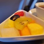 Kwadrans poźniej, na naszych stolikach lądują tace z zapowiedzianym śniadaniem. W kwestii jedzenia, nie ma żadnego wyboru, wszyscy pasażerowie dostają ten sam zestaw: omlet z pieczarkami, musli z jagodami goji, oraz owoce. Szefowa Pokładu osobiście obsługuje pasażerów klasy premium. Przedstawia nam pokrótce wybór napojów. Z racji braku herbaty earl grey decydujemy się na czarną herbatę oraz miętę. W związku z brakiem ekspresu do kawy w tym typie samolotu, rezygnujemy z tego napoju. Liczymy, że na locie transatlantyckim będzie nam dane skosztować przepysznych kaw w ramach słynnego Austrian Airlines Coffee Menu!