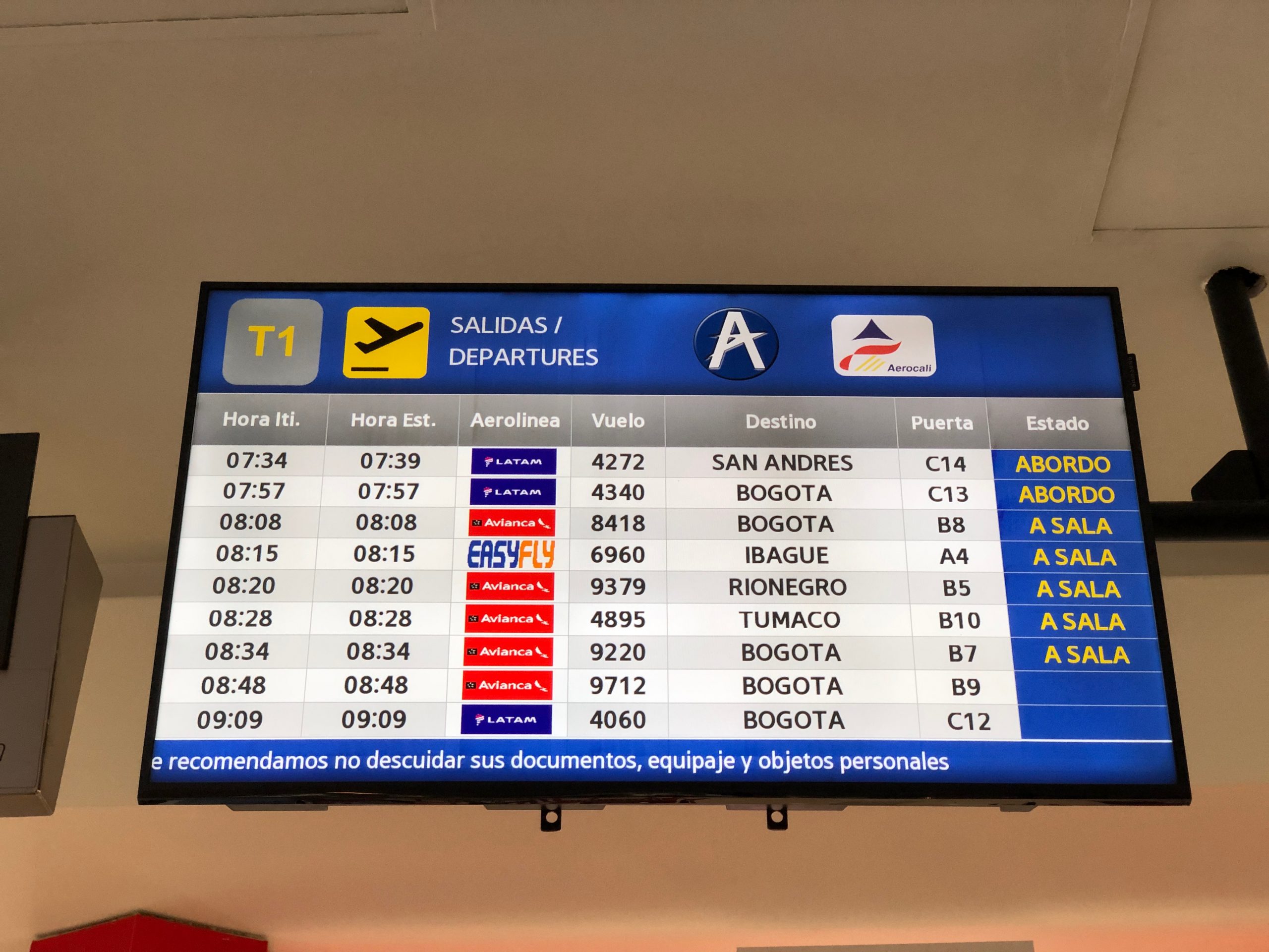 Niecałe dwadzieścia minut po rozpoczętym boardingu, samolot jest gotowy do rejsu. Instrukcja bezpieczeństwa wyświetlana jest na monitorach nad głowami pasażerów. W pierwszej kolejności prowadzona jest w języku hiszpańskim, a następnie po angielsku. Pięć minut po rozkładowym czasie startu samolot wzbija się w powietrze i obiera kurs do Cali.
