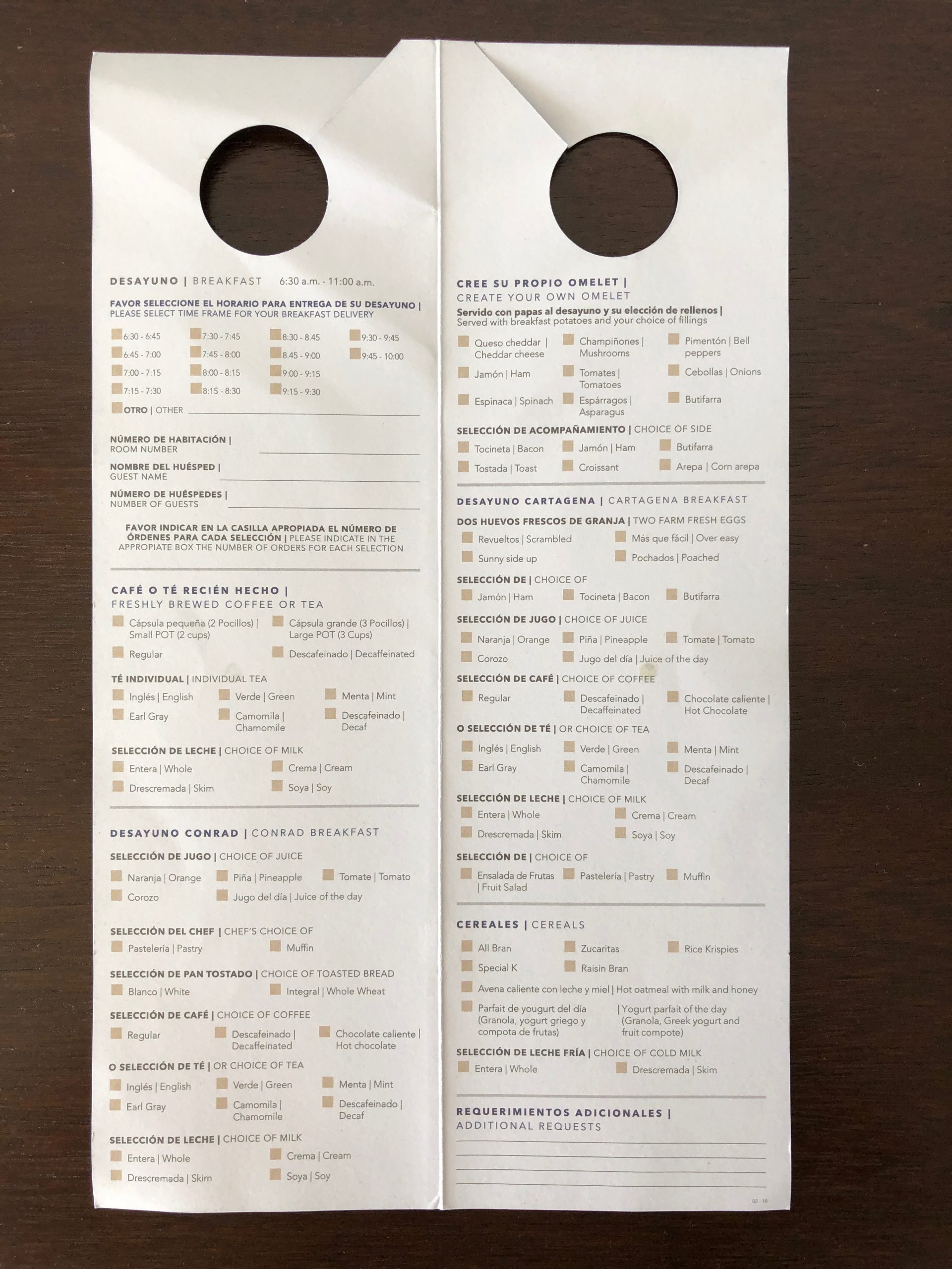 Hilton Honors – Conrad Cartagena – restauracja Adesso Tu – śniadanie – menu śniadaniowe (room service)