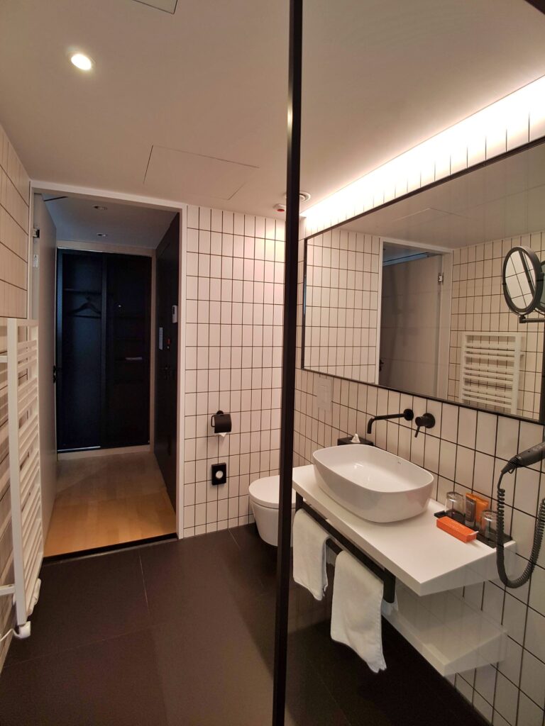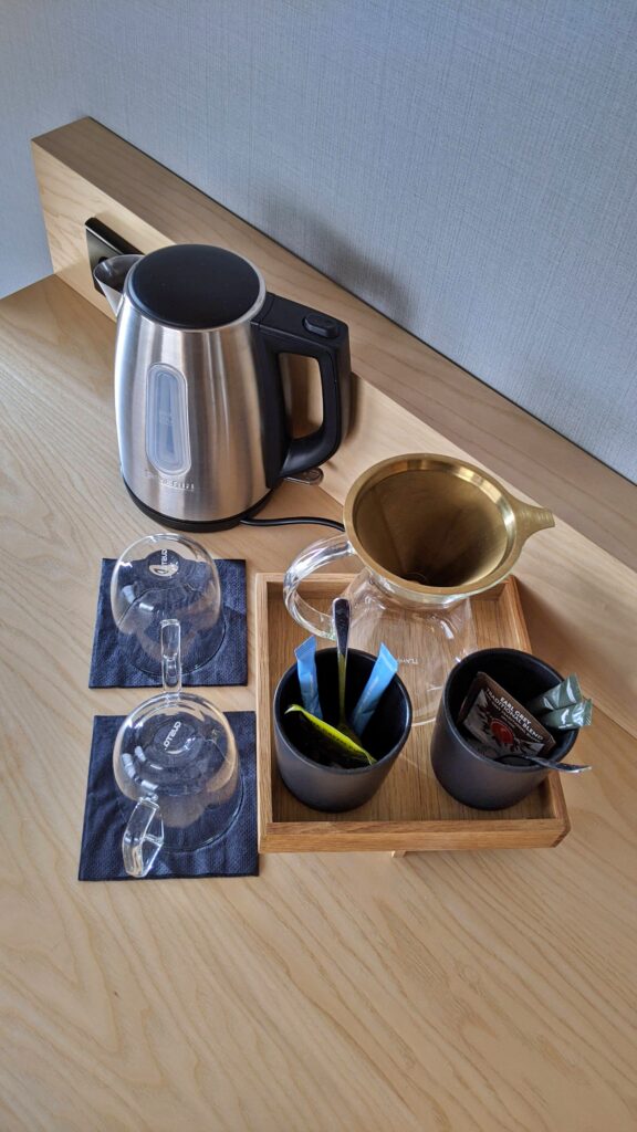 Pokój, który otrzymaliśmy mieści się na końcu korytarza na drugim piętrze. Jest pokojem narożnym. To co nas urzeka po otwarciu drzwi, to fantastycznie duża ilość światła naturalnego, jakie wpada do pokoju przez dwie duże ściany okien. Pokój wygląda na przestronny, a jego centralne miejsce zajmuje duże łóżko, a w zasadzie dwa połączone łóżka typu twin. Wyposażenie dopełnia stolik z dwoma krzesłami, dodatkowe krzesło z podnóżkiem, jednoosobowe biurko z krzesłem, szafa, oraz komoda-barek, na którym swoje miejsce znalazł zestaw do parzenia kawy (dripper) i herbaty. Do pełni szczęścia brakuje nam w pokoju kawy, ale to zapewne niedopatrzenie Housekeepingu, bo raczej powinna tam być, jeśli hotel dysponuje takim sprzętem do jej parzenia, prawda?