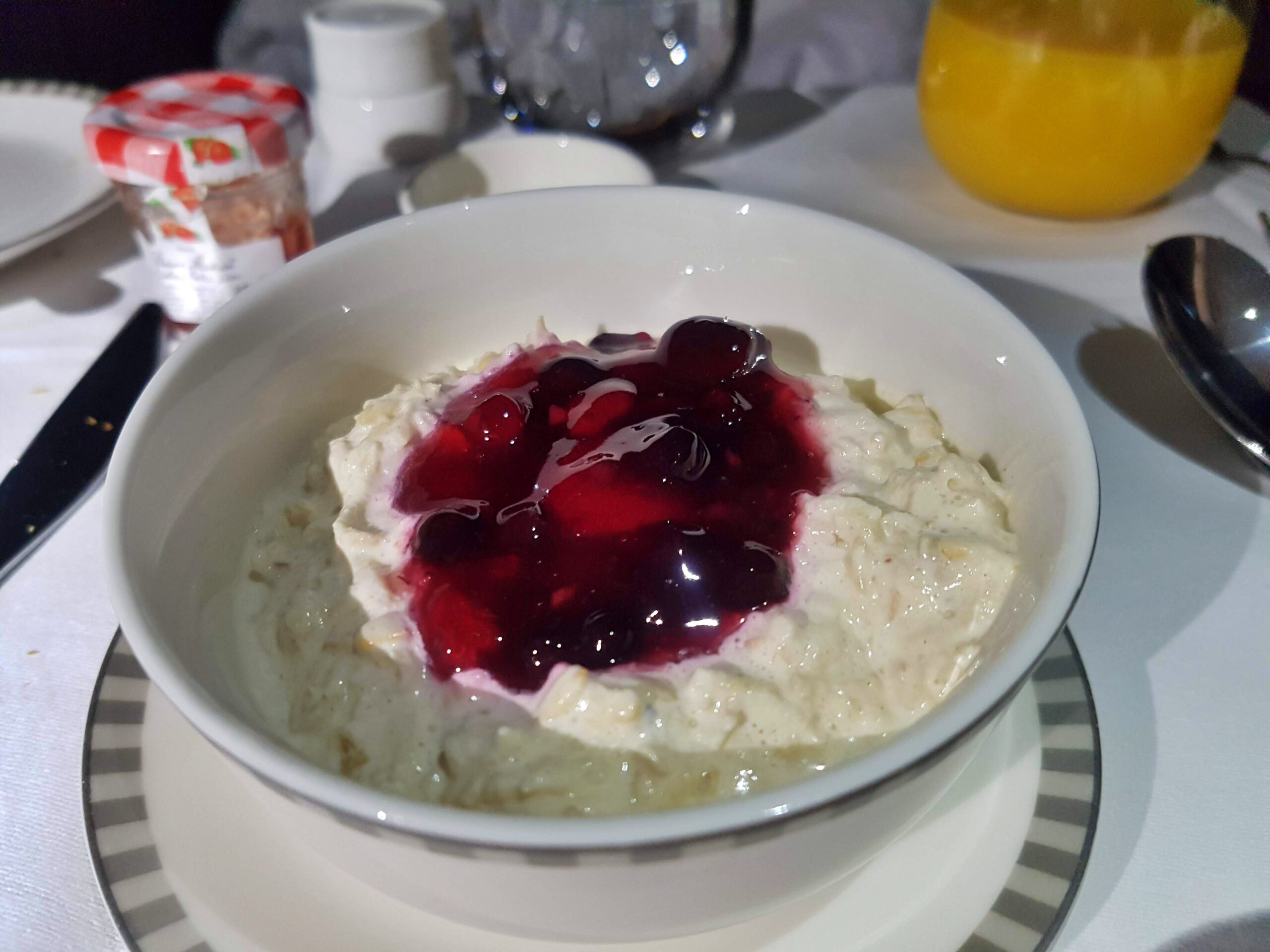 Singapore Airlines – Klasa Biznes w Airbus A380 Singapur – Zurych – śniadanie – granola z mlekiem