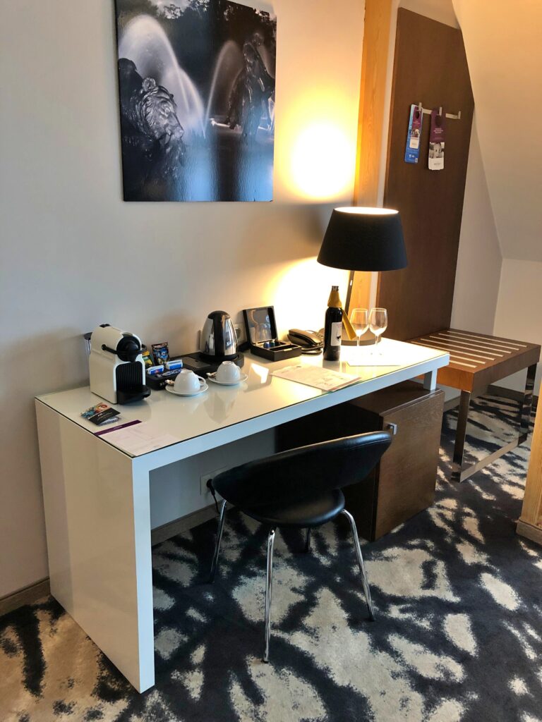 Na biurku znajdujemy list powitalny, butelkę wina czerwonego, stanowiącą welcome gift (dziękujemy!) oraz instrukcję korzystania z pokoju i części wspólnych hotelu w czasach pandemii. Dodatkowo, z informacji hotelowych dowiadujemy się, że w pokoju Privilege, bezalkoholowa zawartość mini barku jest do dyspozycji gości nieodpłatnie.
