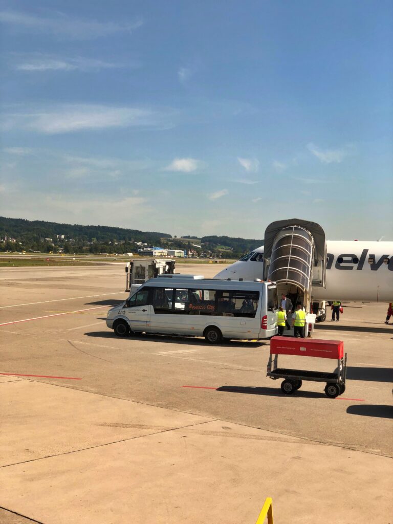 W następnej kolejności, do wyjścia zaproszeni są pasażerowie podróżujący w klasie biznes oraz statusowi, a dalej pozostali podróżni. Do samolotu wszyscy przewożeni są autobusami. Mimo, iż SWISS dysponuje tak zwanymi Business Shuttle, czyli małymi busami dowożącymi pasażerów klasy biznes do samolotów, gdy te nie parkują bezpośrednio przy gate na lotnisku w Zurychu, w przypadku tego rejsu, z nieznanych nam przyczyn, serwis ten nie był dostępny. Podczas naszego boardingu widzieliśmy z kolei, że do sąsiedniego samolotu pasażerowie premium są przewożeni dedykowanym busem.