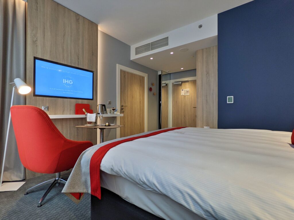 Zdecydowaną część pokoju zajmowało łóżko typu Queen. Dopełnieniem mebli stanowił fotel wraz z małym stolikiem – podstawką pod laptopa, zamiast standardowego biurka, wąską półką pod telewizorem, podstawką pod bagaż oraz jedną pufą. W pokoju, jak w większości pokoi w hotelach tej marki, nie znajdujemy lodówki. Do dyspozycji gości oddano czajnik i zestaw do parzenia kawy lub herbaty.