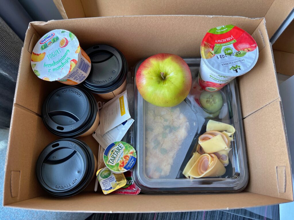 Kolejnego poranka odbieramy z Recepcji nasze śniadaniowe boxy. Według informacji od Recepcjonisty mamy uważać w transporcie, gdyż pudełka zawierają też nasze zamówione gorące napoje. W pokoju, na niewielkim szklanym blacie rozpakowujemy boxy. Mimo zamówienia wersji standardowej i wege otrzymaliśmy dwa jednakowe – raczej nie wegetariańskie. W każdym znajdowała się chłodna i niejadalna jajecznica, kilka plasterków wędliny, sera, ogórka i kawałek pomidora. Dodatkowo: pieczywo, croissant, serek do smarowania, masło, dżem i jogurt. Zestaw uzupełniało jabłko, sok jabłkowy oraz napoje gorące.