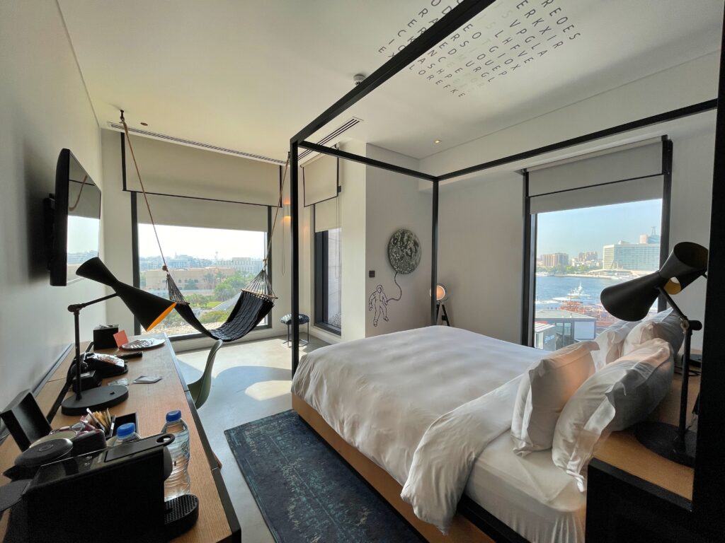 Sam pokój również pozostawia wiele do życzenia – wyglądająca świetnie na zdjęciach huśtawka – hamak jest pełna plam, a jej mocowania są uszkodzone. W pokoju, w stosunku do zdjęć ze strony hotelu brakuje kilku krzeseł. Jedyny pojemnik na odpady w całym pokoju, to malutki śmietnik znajdujący się w łazience. W okolicach łóżka nie znajdujemy miejsca na żadne dodatkowe gniazdo elektryczne – jedyne dwa zajęte były przez lampki nocne. Numer pokoju na telefonie nie zgadza się ze stanem faktycznym. Brak jest charakterystycznych dla marki Canopy skarpet, funkcjonujących tu jako zamiennik hotelowych kapci. W Canopy Al Seef gościom podaje się najtańsze hotelowe kapcie, a charakterystyczne skarpety, jak dowiedzieliśmy się podczas wymeldowania – są gadżetem dodatkowo płatnym, który można zakupić w recepcji. Takich mniejszych bądź większych problemów można by wymieniać bez liku.
