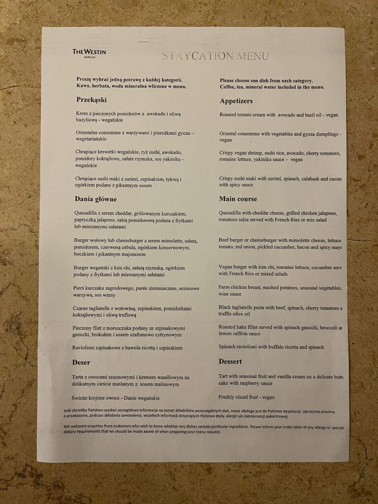 Warto też zaznaczyć, że oprócz dedykowanego menu dla oferty STAYCATION, hotel cały czas oferował szeroki zestaw dań ze swojej restauracji, z regularnej karty. Tym, co przyciągnęło nasz wzrok przy przeglądaniu obu tych ofert był fakt, że spora część dań głównych z menu STAYCATION, była w regularnym menu przystawkami. Warto o tym pamiętać.