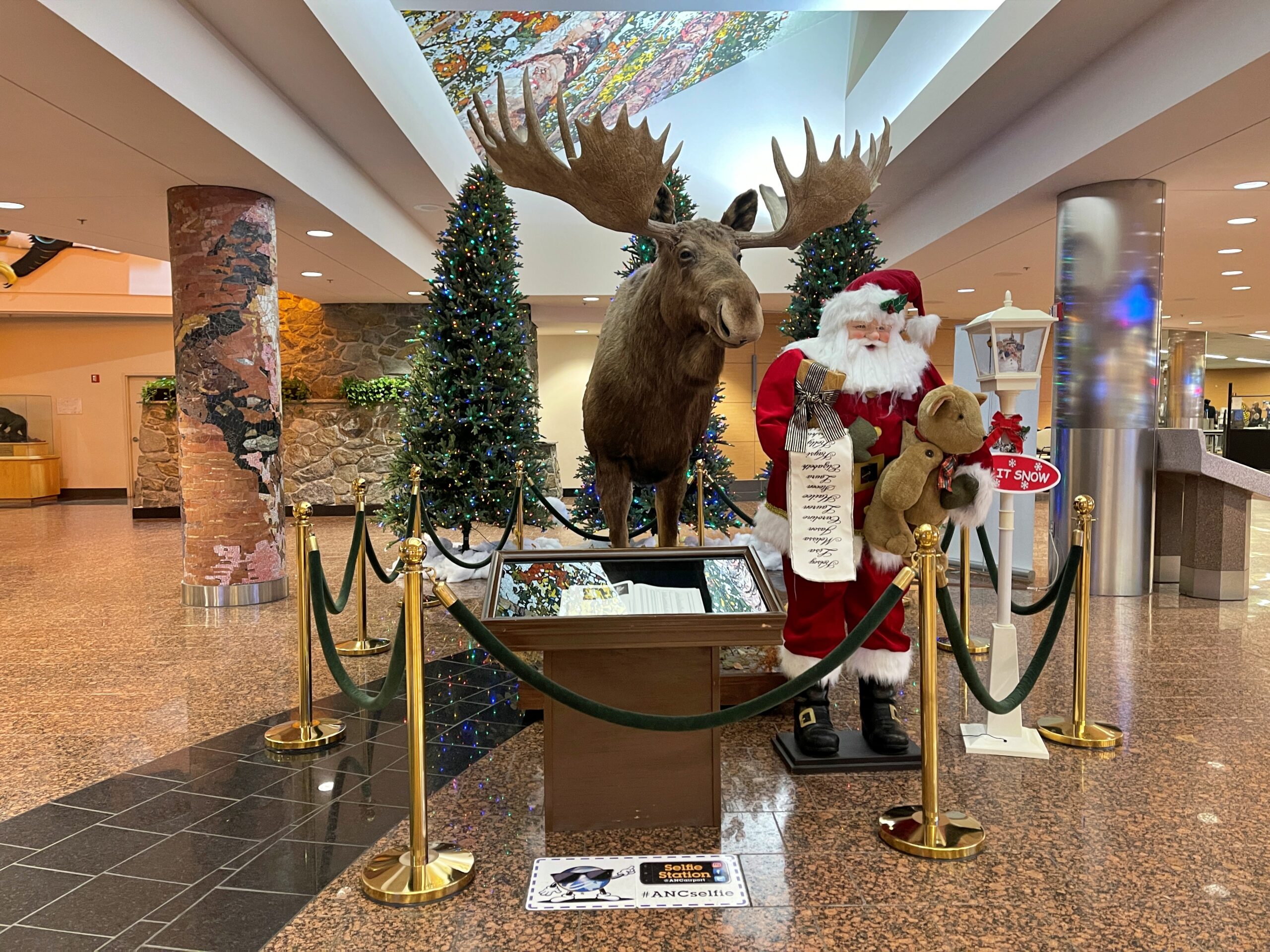 Delta Air Lines – Klasa Pierwsza w Boeing B737 Anchorage – Seattle – lotnisko w Anchorage – ozdoby świąteczne