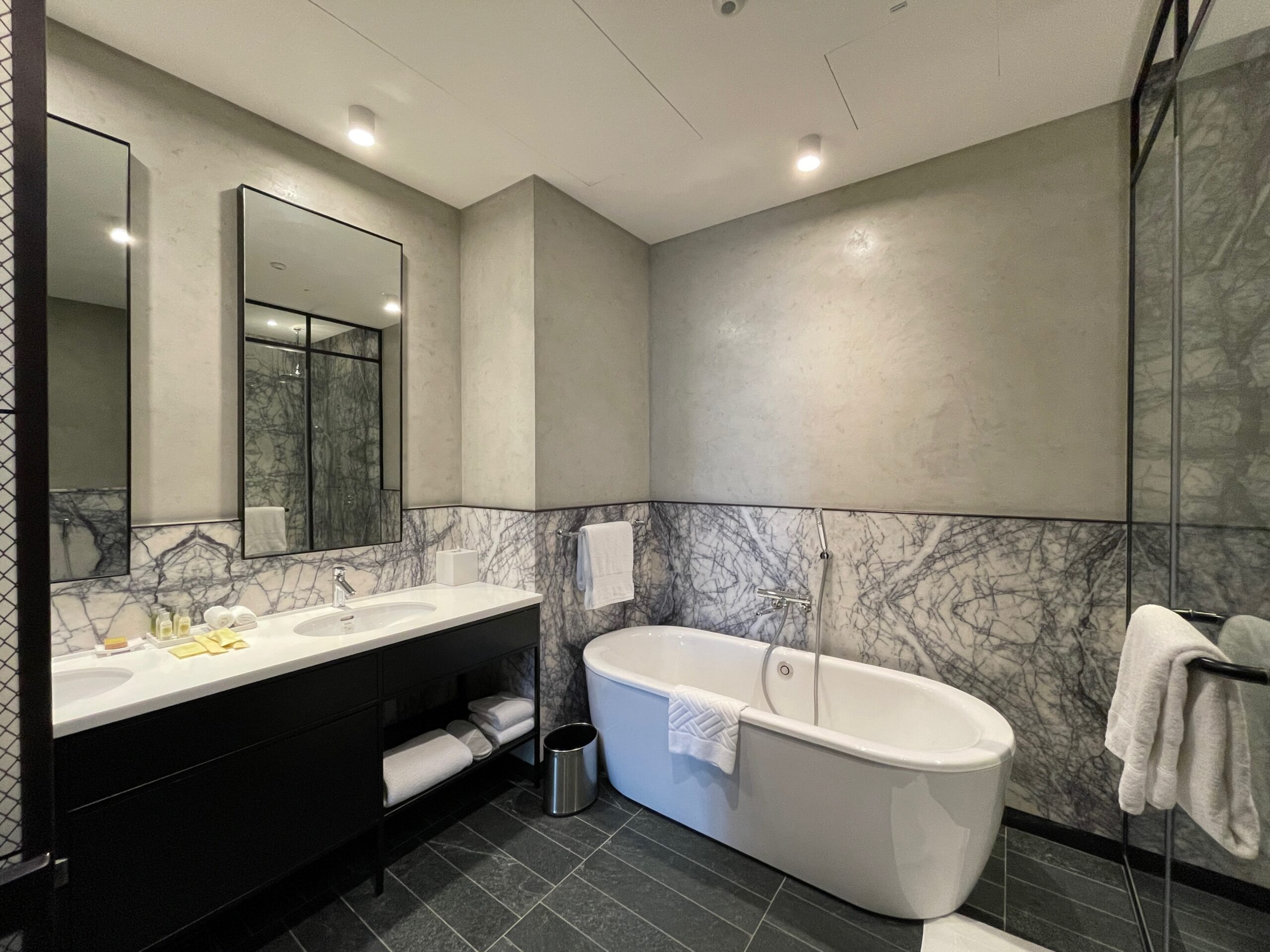 DoubleTree by Hilton Dubai M Square Hotel & Residences, Dubaj – 2327 king deluxe one bedroom suite with view – łazienka – umywalki, wanna