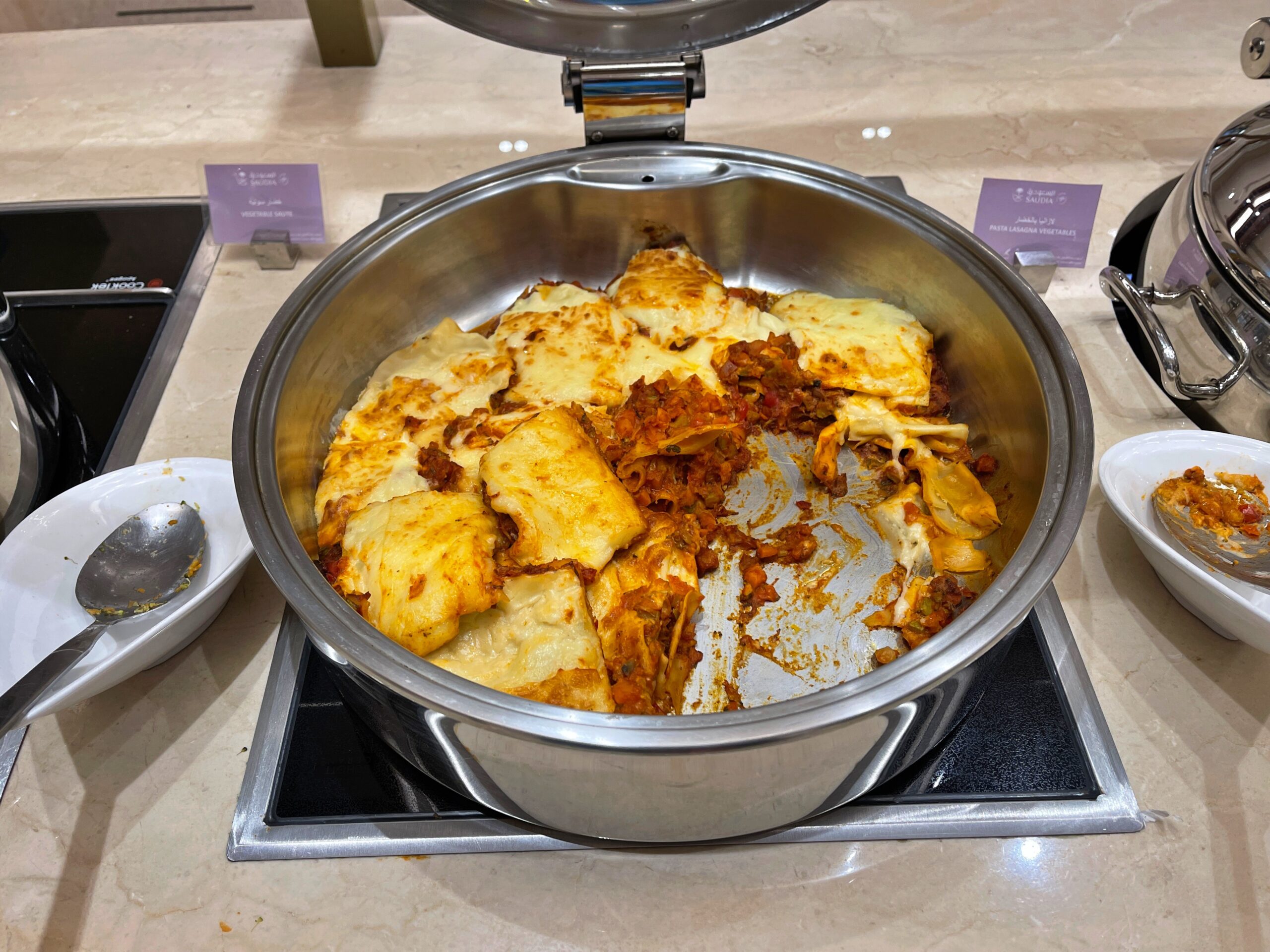 SAUDIA Alfursan Business Class Lounge, Jeddah – bufet – lasagne warzywna