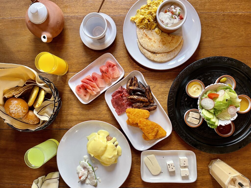 Przez cały pobyt mieliśmy okazję przetestować niemal całą kartę śniadaniową. Smakowały nam zarówno zestawy przystawek (sery, warzywa, oliwki, miód, dżemy), jak i dania z karty. Lokalna wersja jajek po benedyktyńsku (bez tosta), typowo arabskie foul madamas, tosty francuskie z szafranem, granola z jogurtem – wszystko było pyszne, świeże i odpowiednio dopasowane do reszty oferty. Warto też wspomnieć o świetnym, świeżym soku z pomarańczy, oraz mrożonej herbacie, która przydaje się nawet z samego rana podczas lokalnego lata.