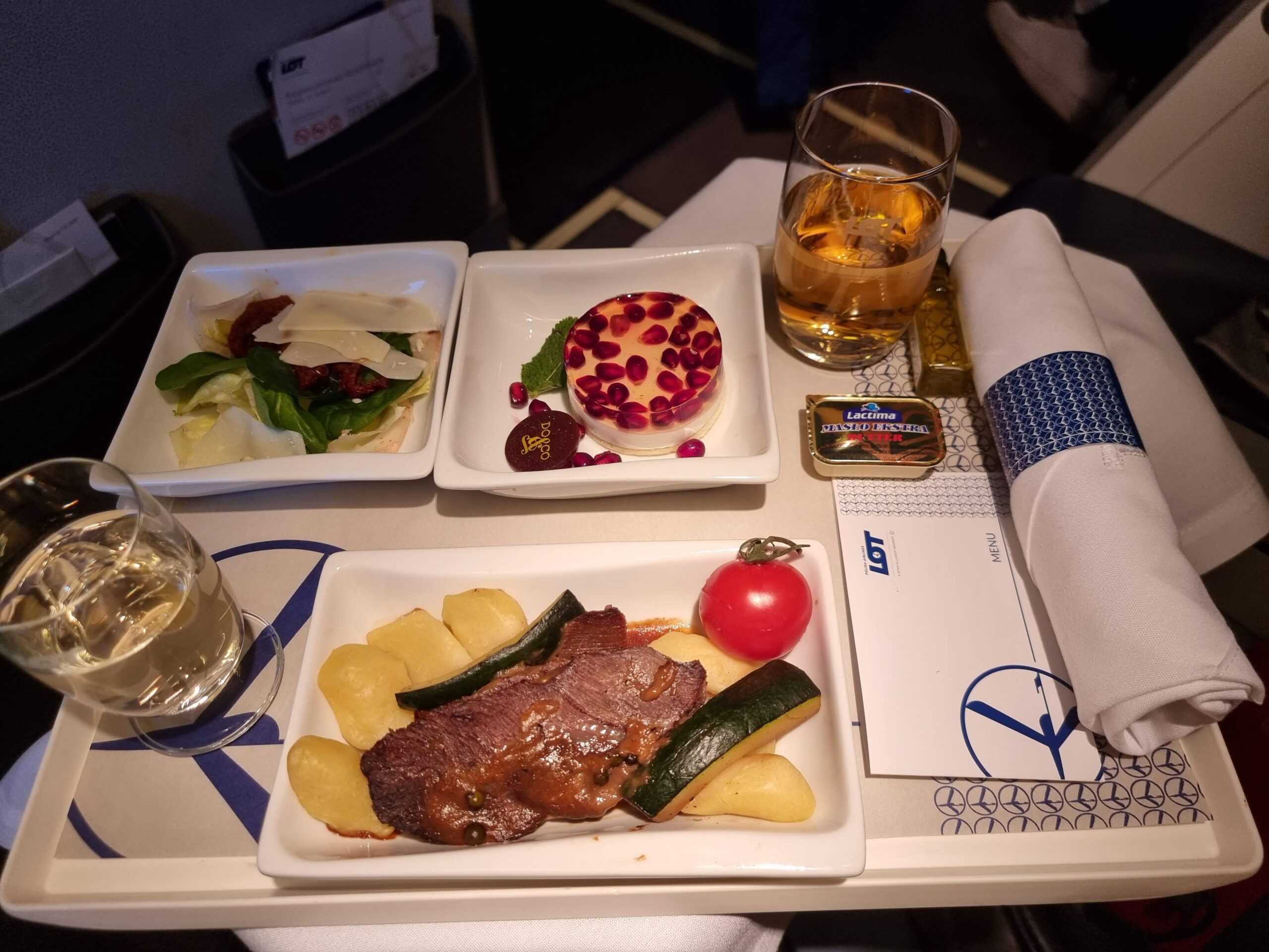 LOT – Klasa Biznes w Boeing B737 Warszawa-Radom – Paryż – klasa biznes – kolacja – sałatka z serem Grana Padano i suszonymi pomidorami, policzki wołowe w sosie pieprzowym z warzywami i kopytkami, ciastko egzotyczne
