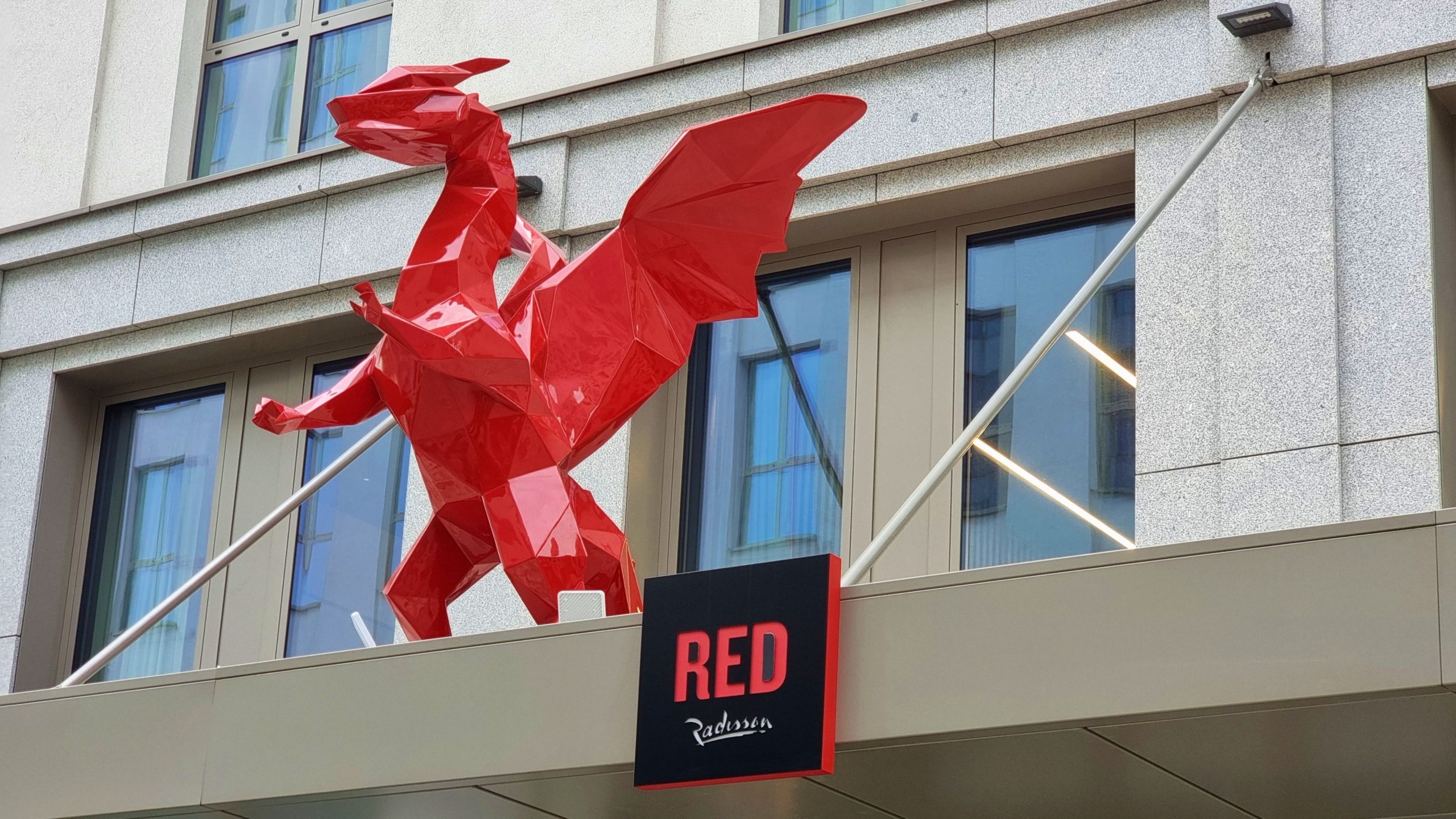Radisson RED Hotel & Radisson RED Apartments, Kraków – wejście do hotelu – logo i „maskotka” hotelu