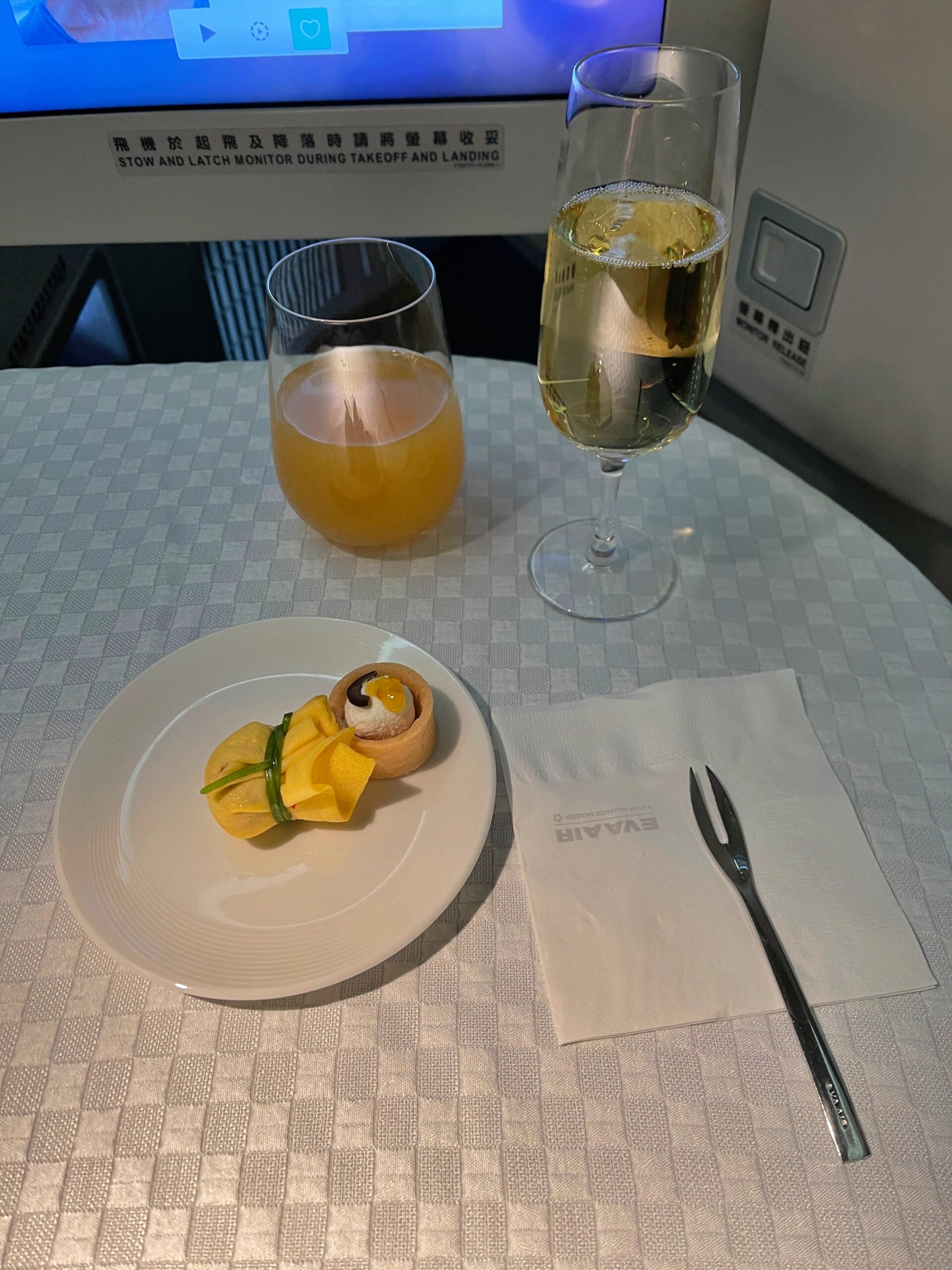 Eva Air – Klasa Biznes w Boeing B777 Tajpej – Paryż – pierwszy serwis – amuse-bouche – krewetki i mięso z kraba w omlecie, tarteletka z kozim serem