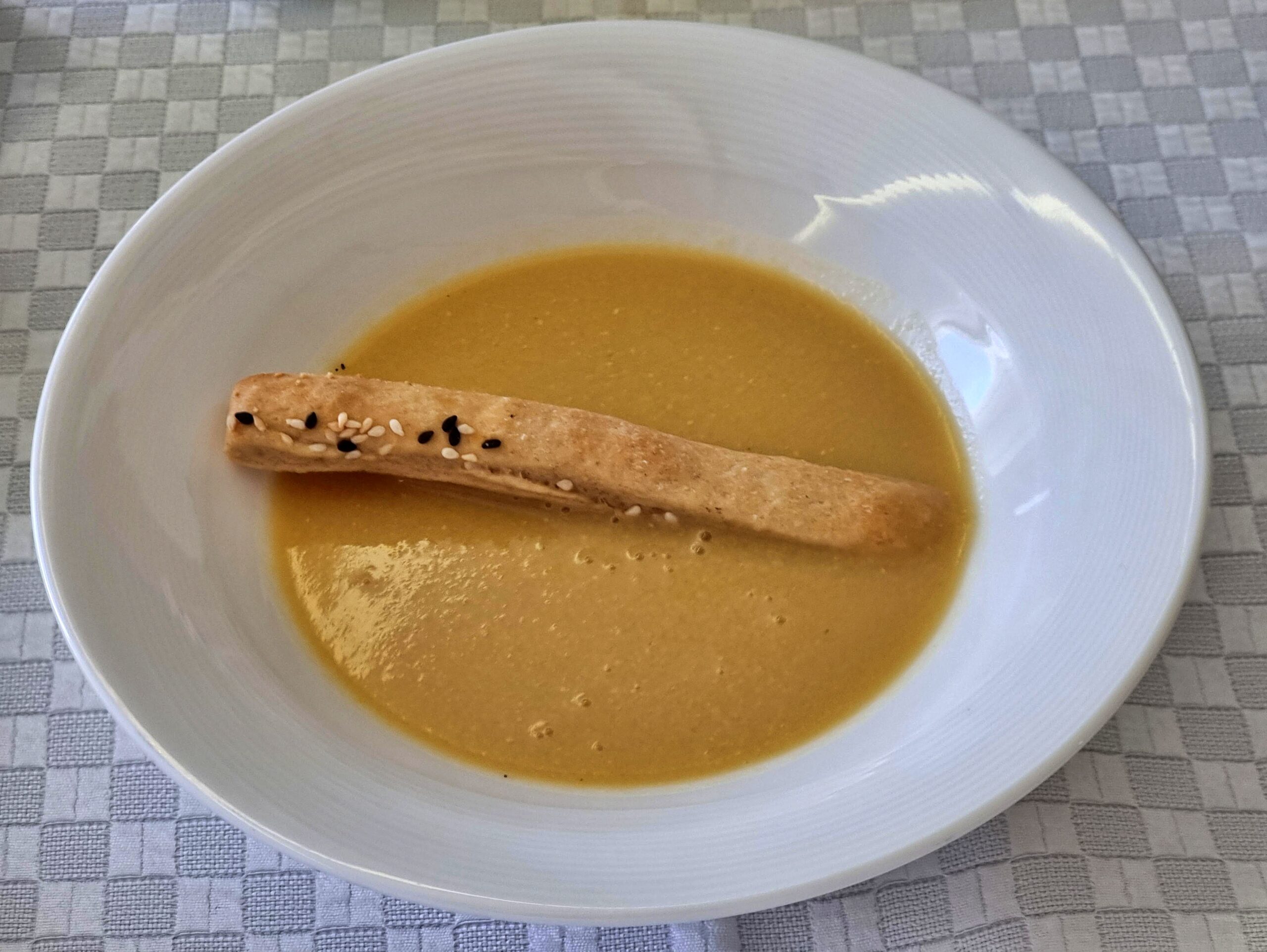 Eva Air – Klasa Biznes w Boeing B777 Tajpej – Bangkok – Londyn – pierwszy posiłek po starcie z Bangkoku – zupa kukurydziana z grissini