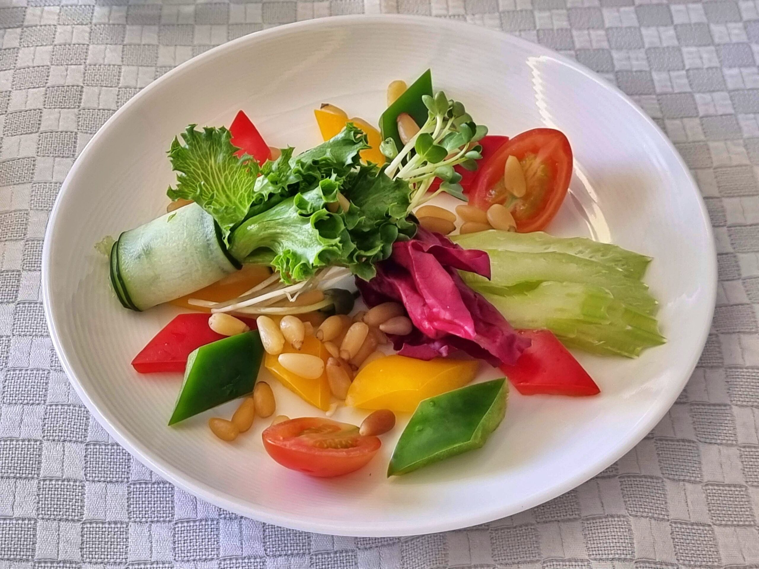 Eva Air – Klasa Biznes w Boeing B777 Tajpej – Bangkok – Londyn – pierwszy posiłek po starcie z Bangkoku – sałatka