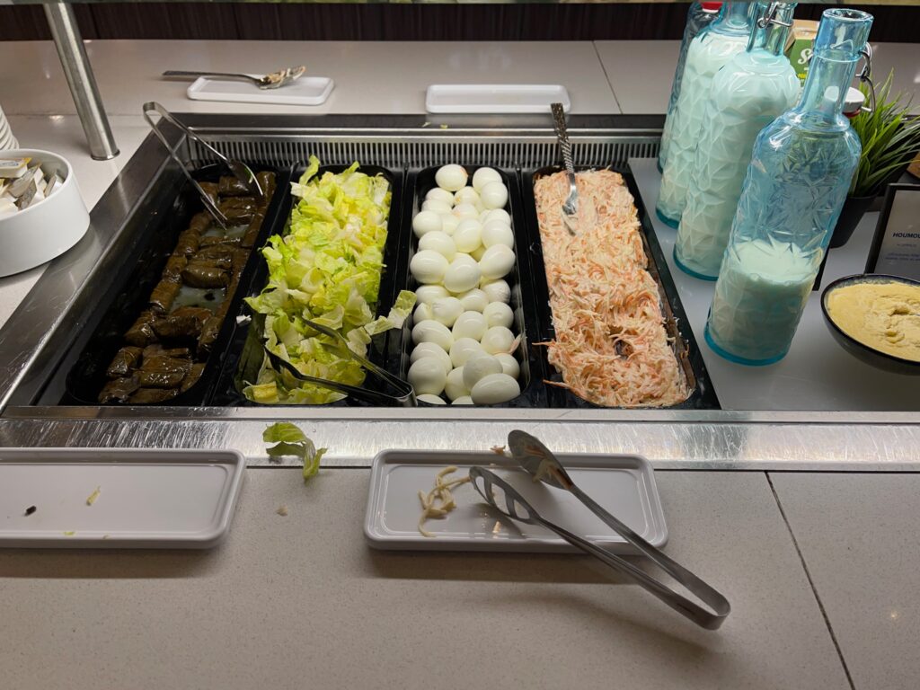Bufet nie jest zbyt bogaty, jak na standardy Hiltona, można ocenić go jako średni, ale oferuje ciekawy wybór ciepłych i zimnych dań, z kilkoma pozycjami, które nie są standardowe dla hoteli w tej części Europy – jak na przykład pasta z oliwek, coleslaw, czy dolmy. Z ciekawostek, jest tu również specjalna maszyna do przygotowania jogurtów.