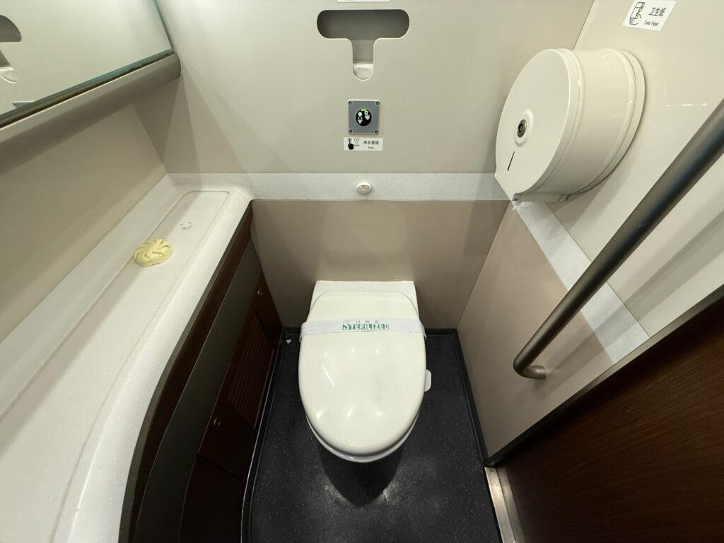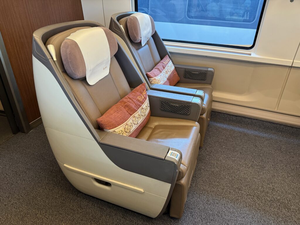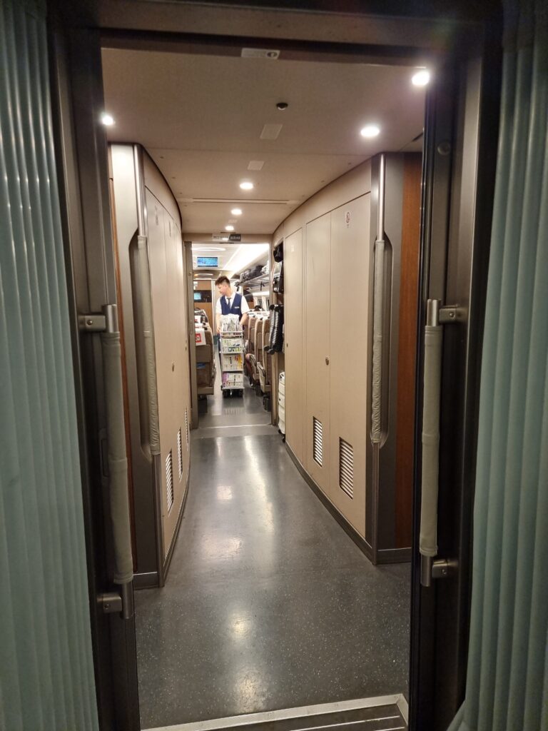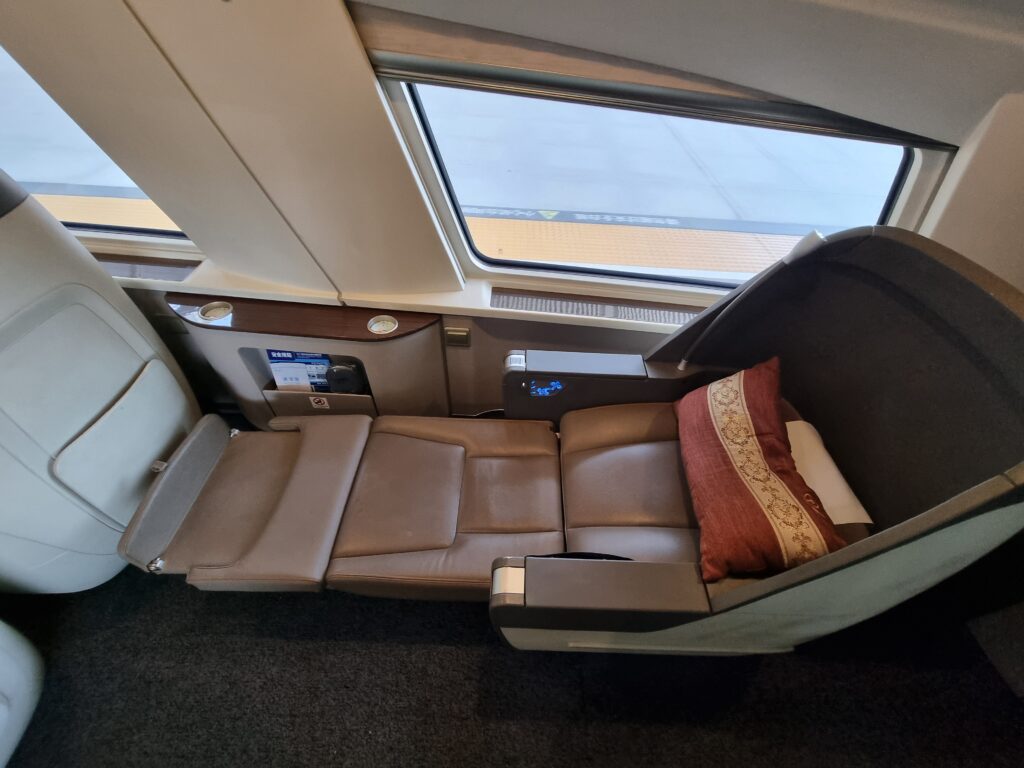 Gdy wchodzimy do wagonu, część miejsc jest już zajętych przez pasażerów, którzy wsiedli na wcześniejszych stacjach. Nasze miejsca są przygotowane – na parapecie czekają na nas przekąski oraz chusteczka odświeżająca, na fotelu znajduje się poduszka, a kapcie czekają w bocznej kieszeni. Jeśli ktoś potrzebuje kocyk, może go zamówić u Stewardessy. W kabinie panuje przyjemny chłód i większość pasażerów korzysta z tego udogodnienia odpoczywając na rozłożonych fotelach.