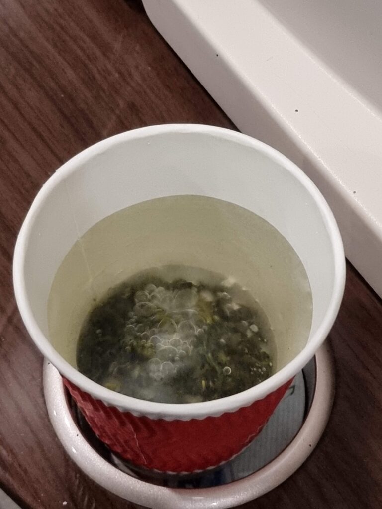 Kilka minut później Stewardessa przynosi herbatę w papierowym kubku. W trakcie podróży kilkukrotnie dolewa do niego wody z czajniczka.