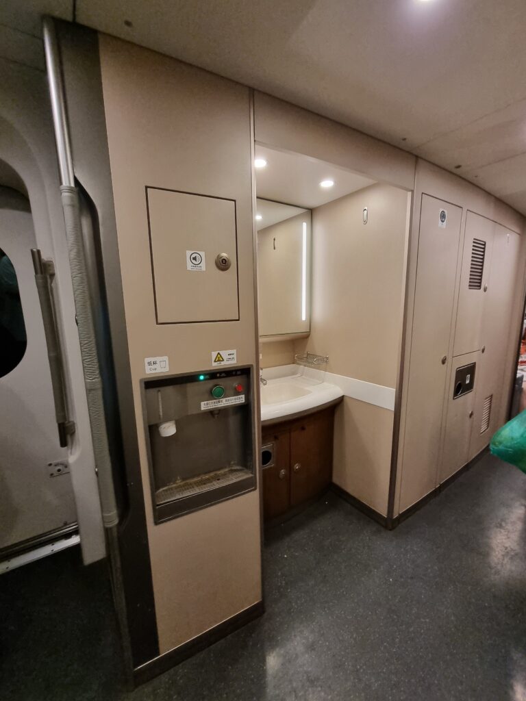 W pociągu są oczywiście również toalety – zarówno chińskie (dziura w podłodze), jak i te bliższe europejskim standardom. Obok toalet są również umywalki oraz poidełka z wodą ciepłą i zimną.