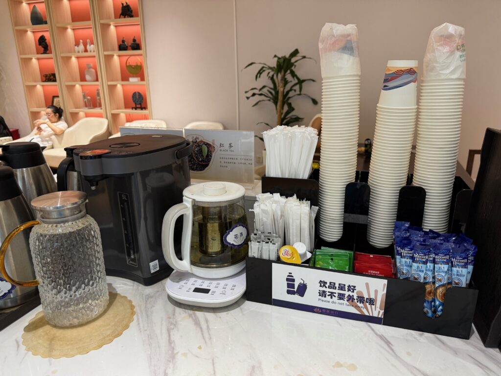 Przed przyjazdem pociągu na każdą stację Stewardessa przechodzi przez kabinę klasy biznes i uzupełnia przekąski oraz chusteczki przy nie zajętych fotelach.