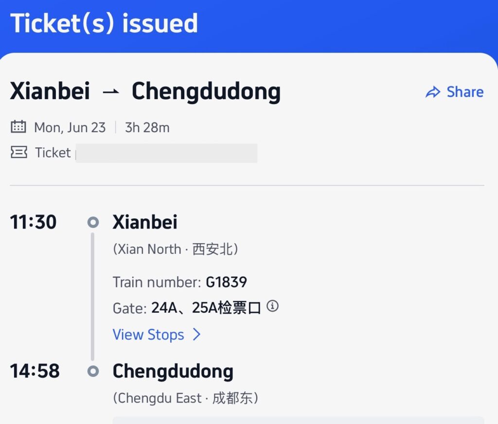 Trasa: Xi’anbei (Xi’an North) – Chengdudong (Chengdu East)