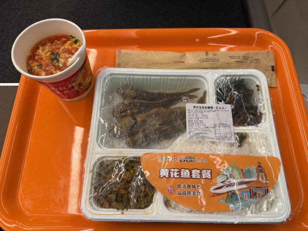 Po wyruszeniu pociągu ze stacji Stewardessa podchodzi do nowoprzybyłych pasażerów i pyta o wybór napojów – dostępna jest woda, herbata, kawa, sok. Następnie informuje, że dla pasażerów w klasie biznes jest przewidziany lunch w cenie biletu: można wybierać między wołowiną, rybą i kurczakiem. Wszyscy decydujemy się na wołowinę.