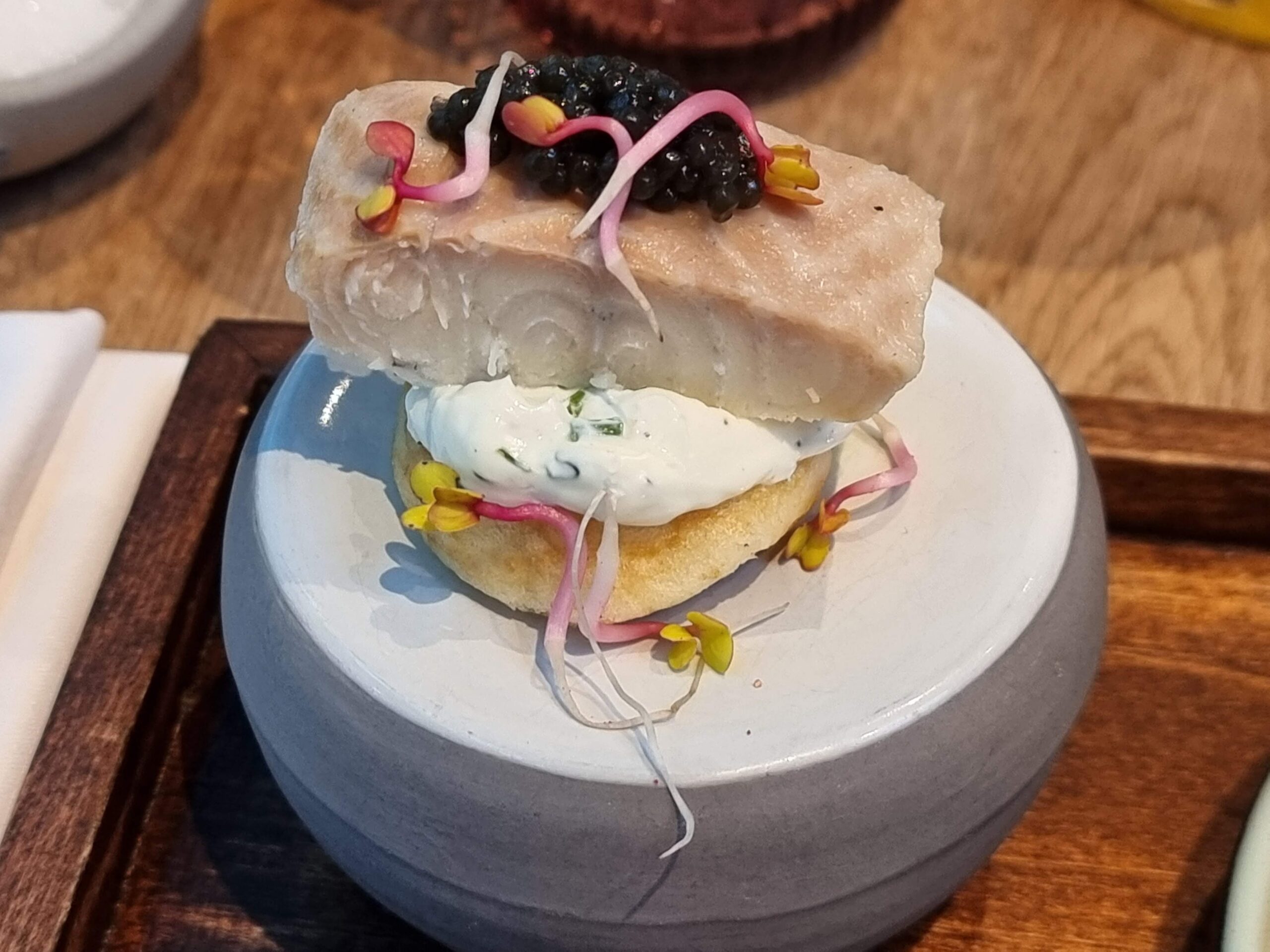 Hotel Verte, Warsaw, Autograph Collection – Pawilon – śniadanie – zestaw Verte – wędzony węgorz, blin, kawior Antonius