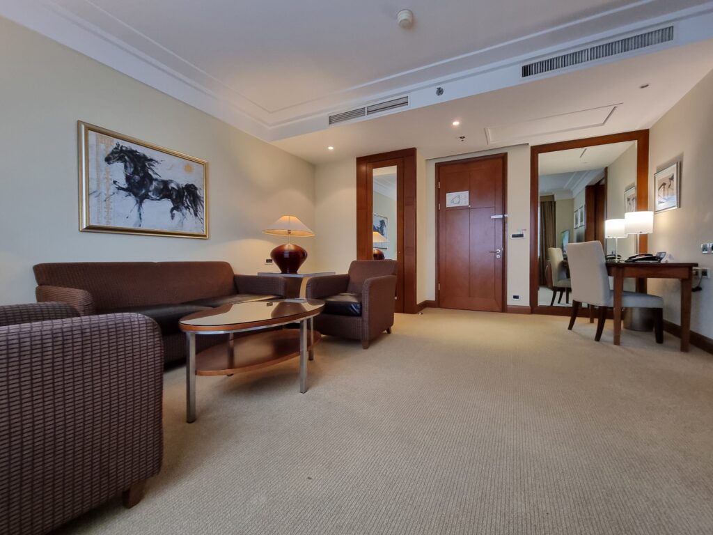 Po wejściu z hotelowego korytarza znajdujemy się bezpośrednio w pokoju dziennym. Po lewej stronie wita nas tu biurko, po prawej zabudowana szafa, a nieco dalej komplet – kanapa, dwa fotele i stolik kawowy. Vis-a-vis miejsca wypoczynku króluje komoda z telewizorem.