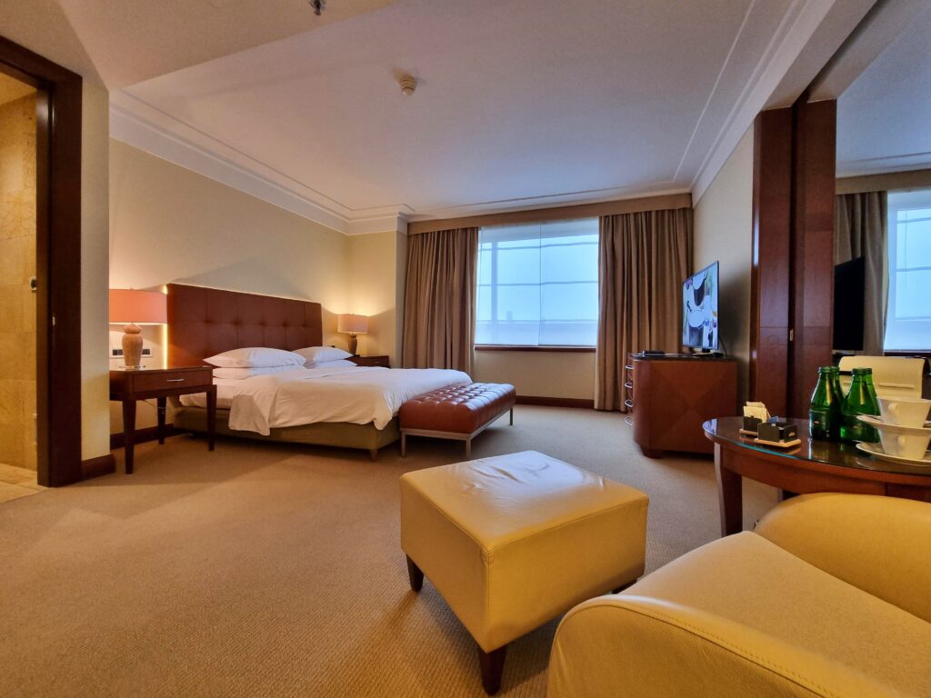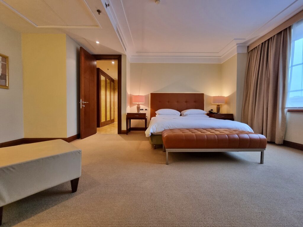 Pomiędzy biurkiem a komodą znajduje się szerokie wejście do sypialni. Tu również jest sporo przestrzeni. Głównym tematem tego połączenia jest oczywiście wielkie łóżko. Jest tu też fotel, z otomaną, ławka przy łóżku, kolejna komoda z telewizorem. Z trudnego do zrozumienia powodu hotelarze z Regenta zdecydowali, że idealnym miejscem na ekspres do kawy i czajnik będzie mały stolik ustawiony przy wspomnianym wcześniej fotelu w sypialni. Należy jasno zaznaczyć, że przedmioty te znalazły się tu najprawdopodobniej czysto przypadkowo, jako elementy wymagane – bądź to przez kategoryzację, bądź to przez markę, pod którą wcześniej działał obiekt. Korzystanie z tych „udogodnień” jest ekstremalnie utrudnione i niewygodne. Zapewne nie jest to wina przypadku.