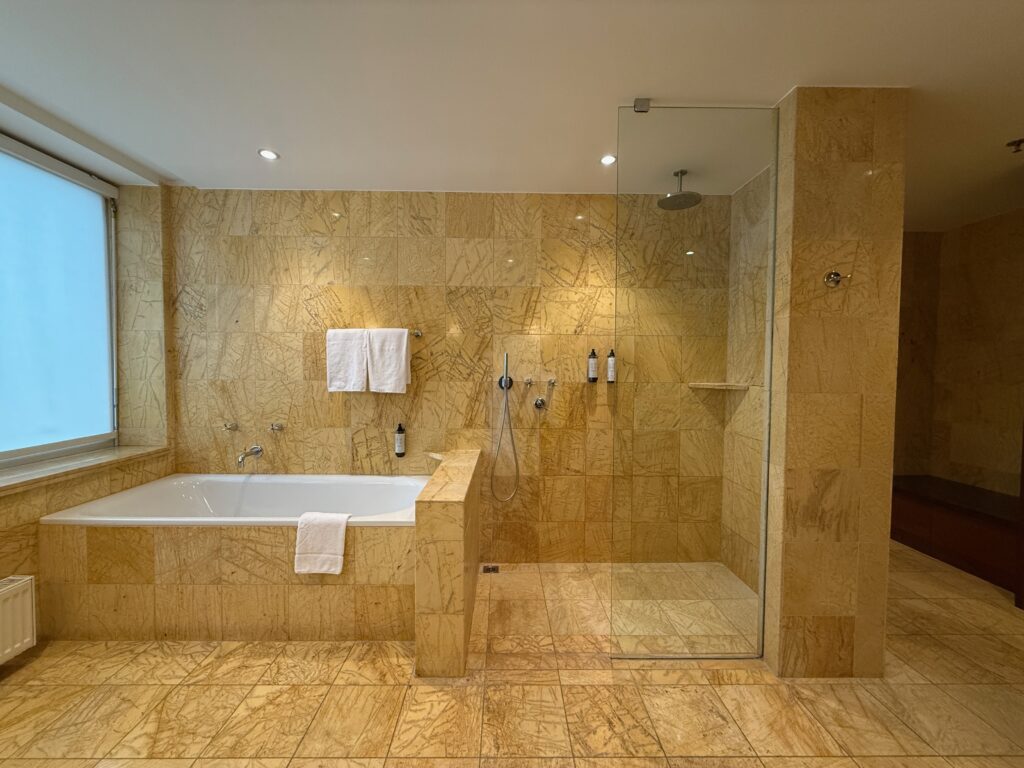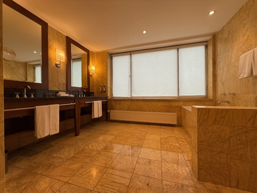 Z sypialni, poprzez korytarz z wygodną podstawką pod walizkę oraz szafą, który pełni rolę garderoby, przechodzimy do łazienki. Mamy tu do dyspozycji toaletę, wannę, prysznic, oraz dwie umywalki. Co dziwne, jest to jedyna łazienka w całym dużym apartamencie.