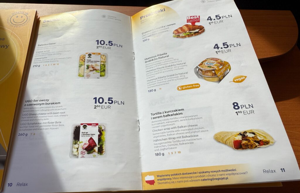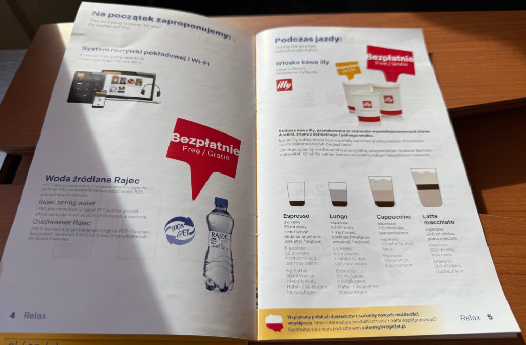 Gdy opuszczamy ostatni dworzec w Warszawie Pani Kierownik ogłasza, że niedługo Personel Pokładowy rozniesie wodę dla pasażerów, a na dalszym etapie podróży będzie dostępna oferta posiłków oraz kawa Illy. W wagonach Standard-Astra oraz Low Cost podróżni powinni zamawiać catering poprzez aplikację przewoźnika. W pozostałych wagonach, Personel Pokładowy będzie zbierać zamówienia osobiście.