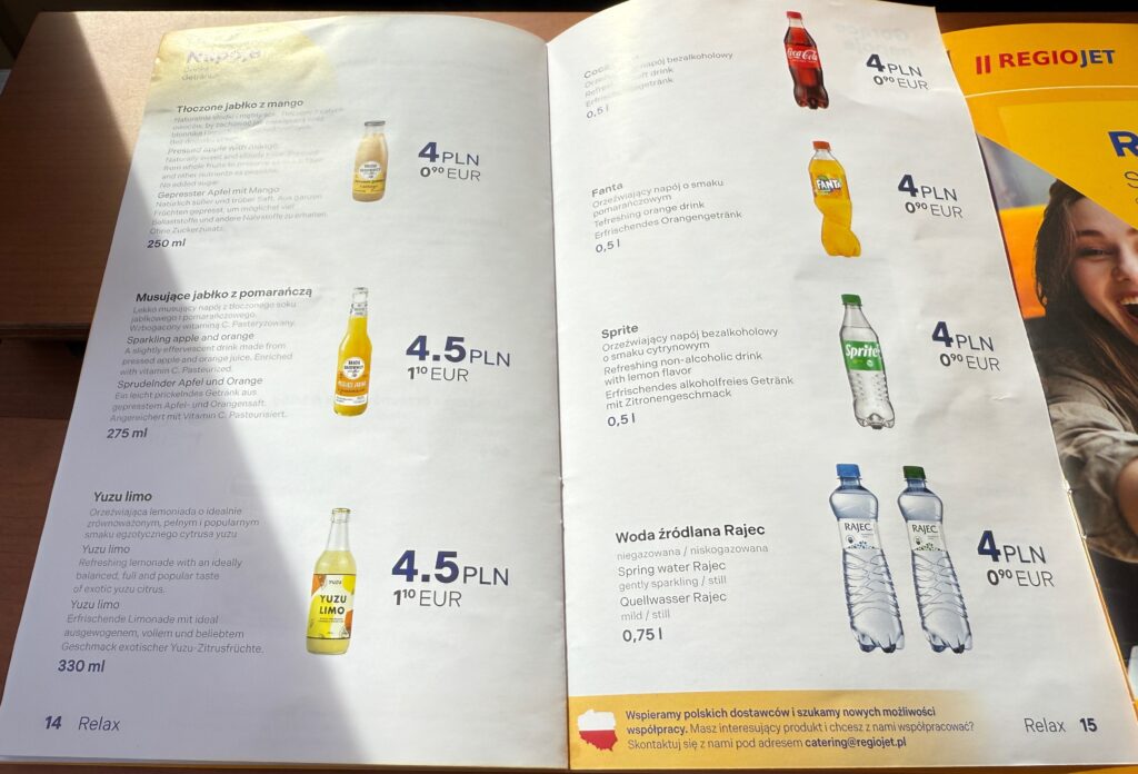Zgodnie z wcześniejszą zapowiedzią Pani Kierownik pociągu wkrótce po wyjeździe z Warszawy w naszym wagonie pojawia się Obsługa RegioJet rozdająca wodę i przyjmująca zamówienia na dania z oferty pokładowej.