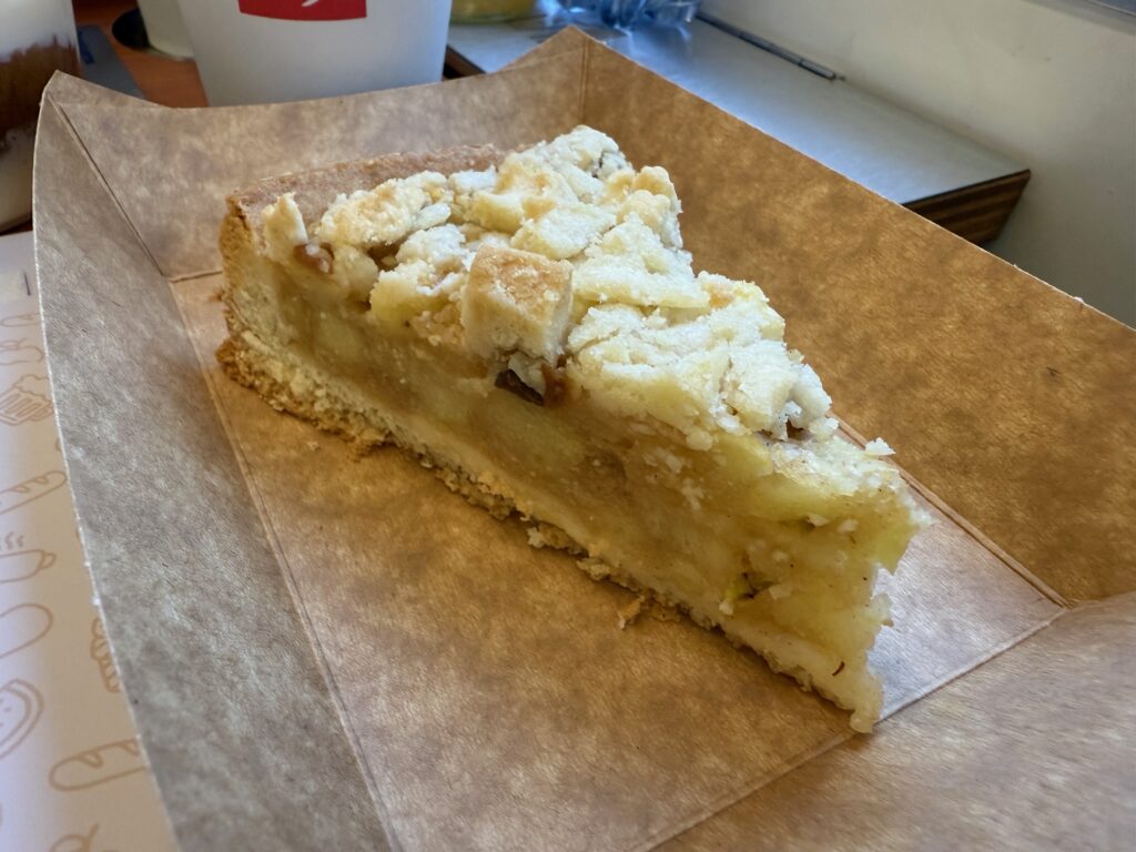 Szarlotka jest wilgotna i nie za słodka, co nam pasuje. Dobry stosunek ilości jabłek do ciasta.