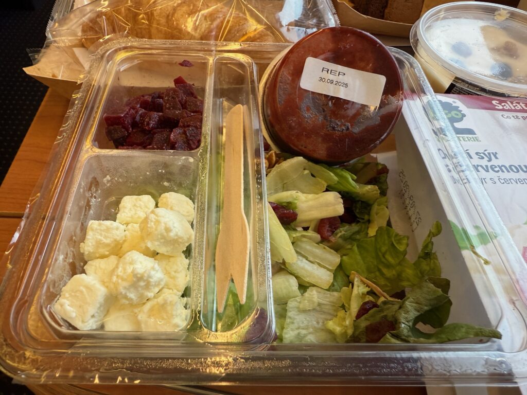 Sałatka – jak na takie danie przystało składa się w większości z sałaty, ale dodatki w postaci sera w typie feta oraz buraków, orzechów i sosu jabłkowo-buraczanego ożywiają tą pozycję. Podobnej jakości sałatki kupimy w większości popularnych marketów, czy sklepów typu “convenience”. Wbrew pozorom – porcja dość duża i sycąca.