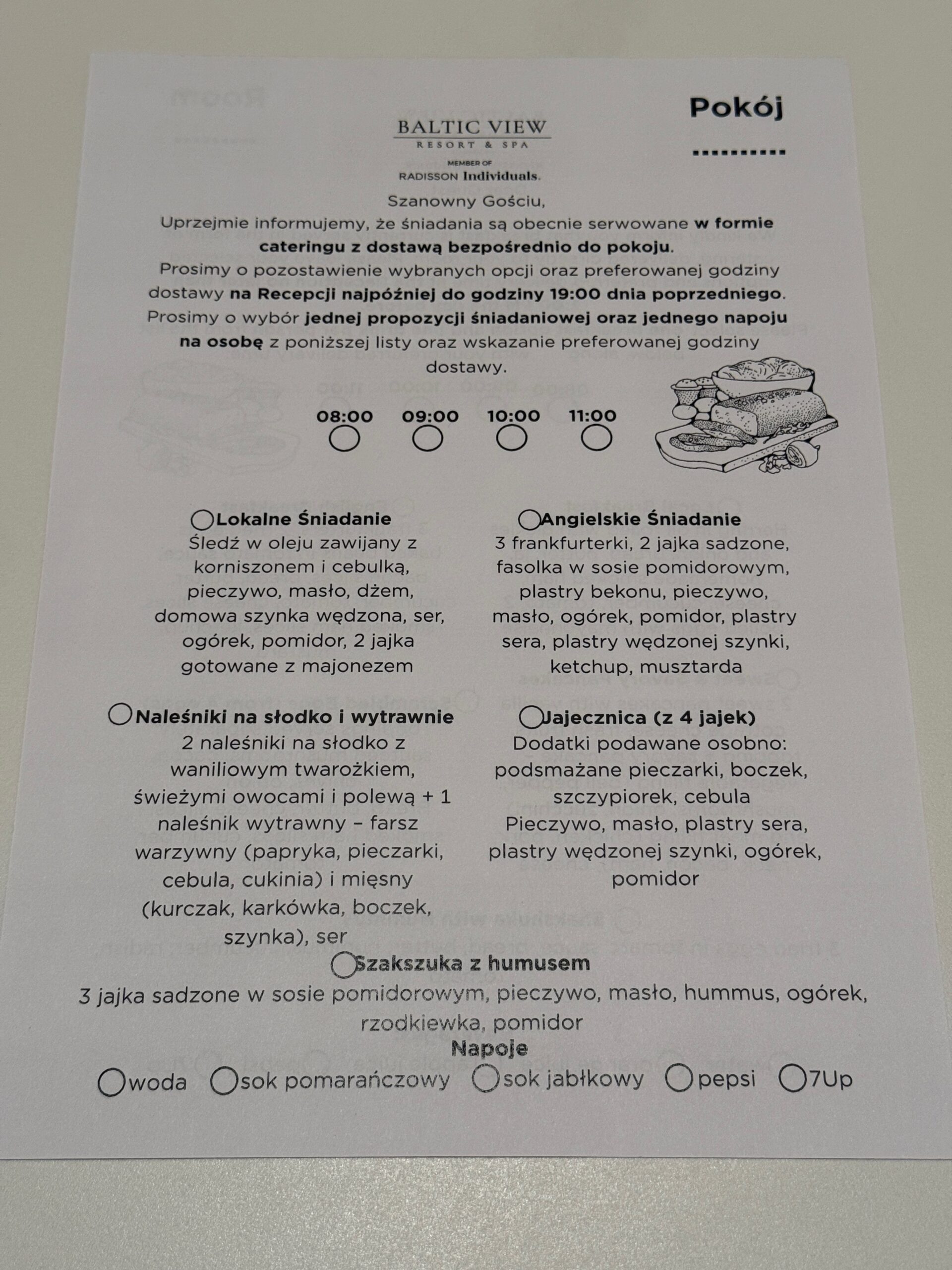 BALTIC VIEW Resort & SPA a member of Radisson Individuals, Międzyzdroje – 410 Superior Room – Sea View – formularz zamówienia śniadania