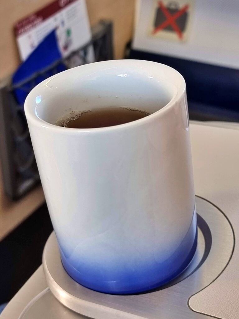 Prosimy o sok jabłkowy i pomidorowy, ale okazuje się, że nie ma w ofercie. Szkoda – w klasie ekonomicznej premium serwowano jeden z pyszniejszych soków jabłkowych jakie kiedykolwiek piliśmy na pokładzie samolotu.