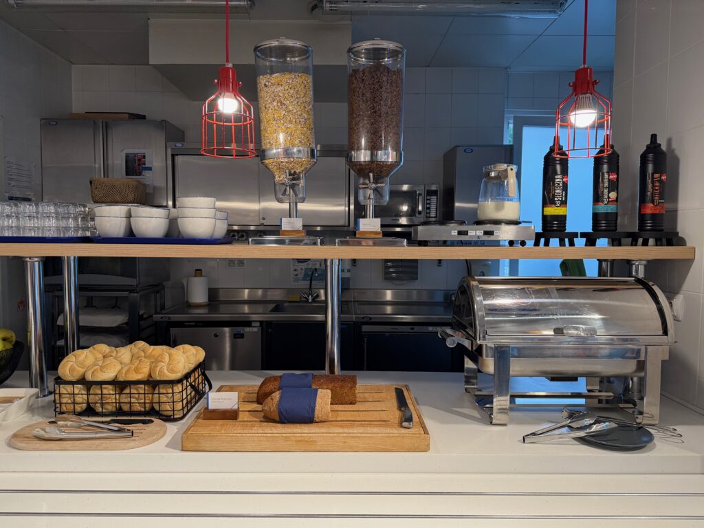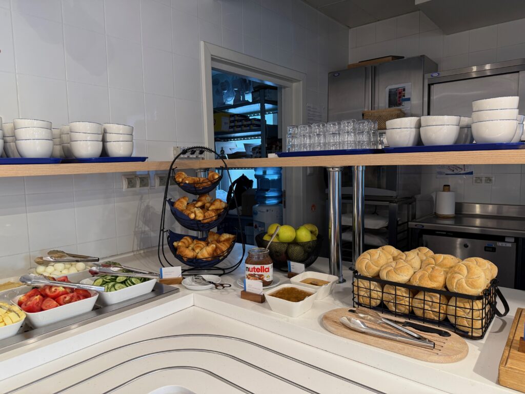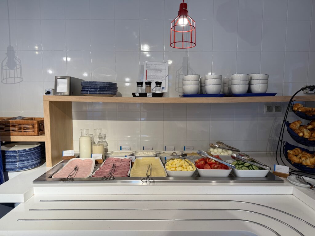 Pierwszy posiłek dnia serwowany jest w pomieszczeniu za recepcją. Kiedy pojawiamy się tu o godzinie rozpoczęcia serwisu wszystko jest już przygotowane. Główna zawartość bufetu to zimna płyta z serami, wędlinami, warzywami, płatkami śniadaniowymi i różnego rodzaju dodatkami. Z ciepłych elementów dostępne podczas naszego pobytu były parówki oraz małe placuszki ziemniaczane.