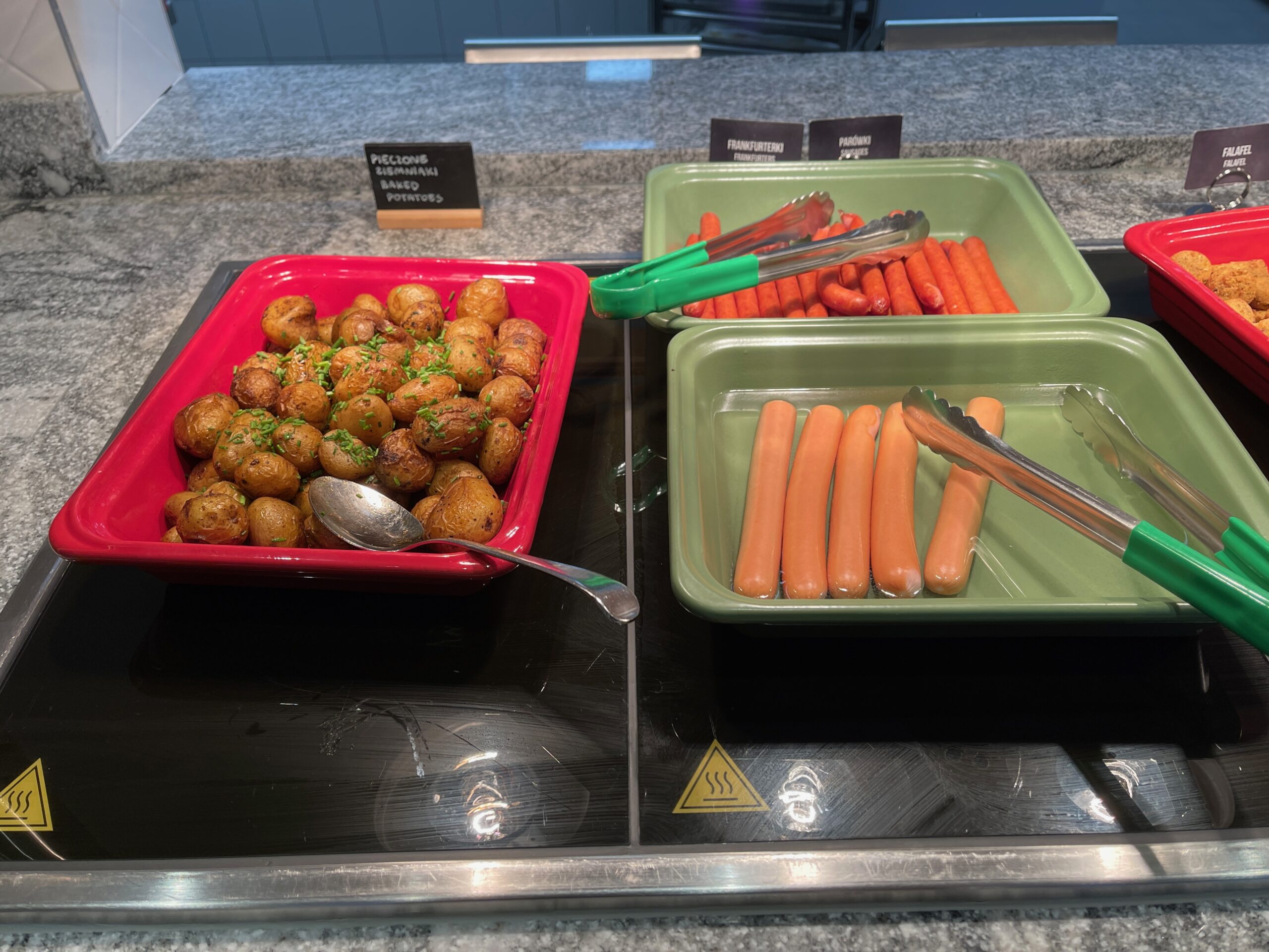 Hampton by Hilton Łódź City Center – śniadanie – bufet – pieczone ziemniaki, parówki, frankfurterki