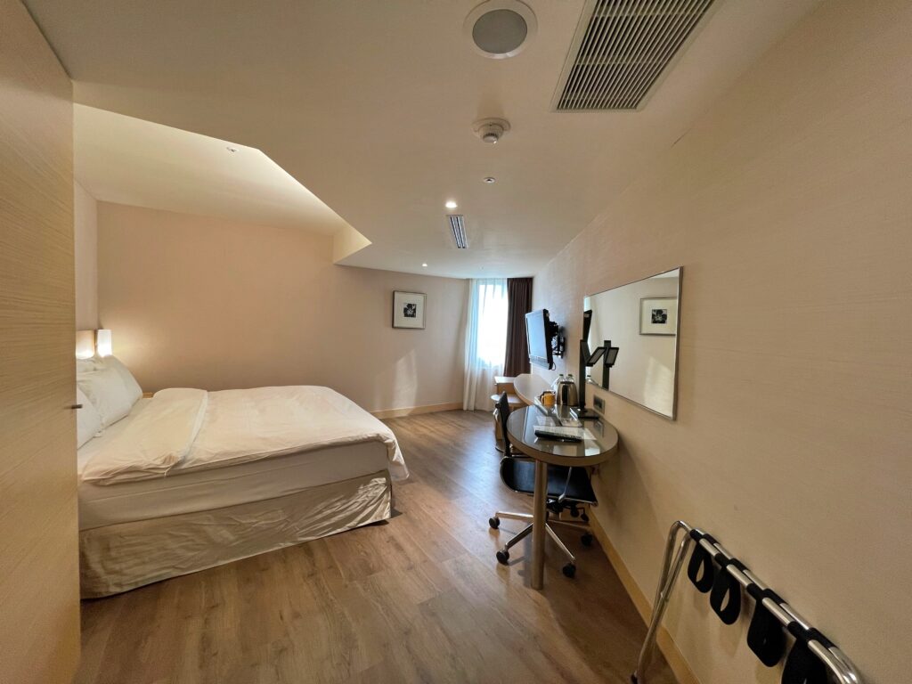 Nasz pokój, na dziesiątym piętrze, o numerze 1002 jest zaskakująco duży, jak na dwadzieścia trzy metry kwadratowe, o których na swojej stronie informuje hotel. Oczywiście, głównym elementem jest tu duże łóżko. Nie brakuje jednak biurka z miejscem do pracy, dodatkowego, owalnego stolika, małego stolika kawowego, krzesła obrotowego, podstawki na bagaż, czy szafy z sejfem i hotelowymi kapciami.