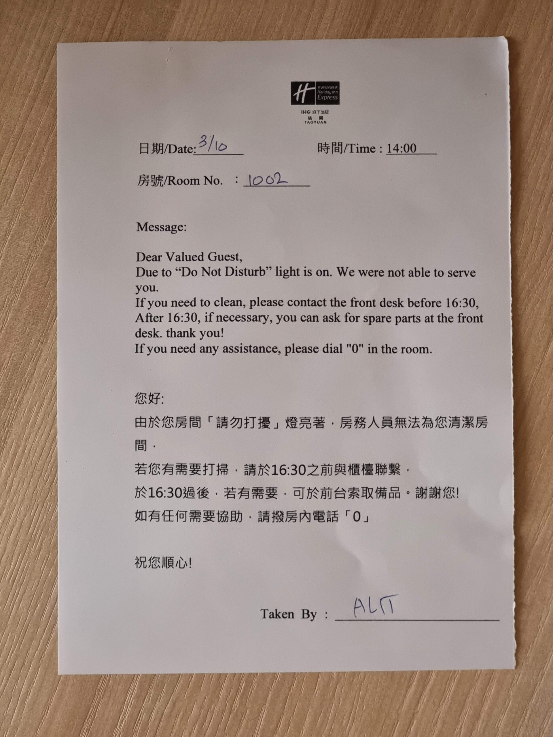 Holiday Inn Express Taoyuan – 1002 One King Standard Room – informacja o próbie sprzątania pokoju